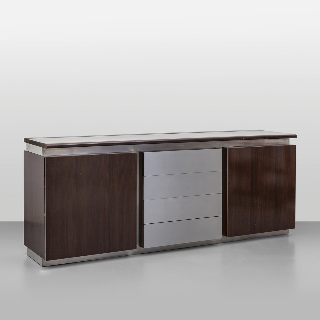 A sideboard 1971. Lacquered wood and opaque stainless steel With the Manufacturer's label. 28.7 (h) x 74.8 x 17 inches.