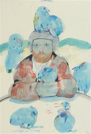 Lotto 1122 | Antonio Possenti Autoritratto con sei uccelli Tecnica mista su carta, cm....