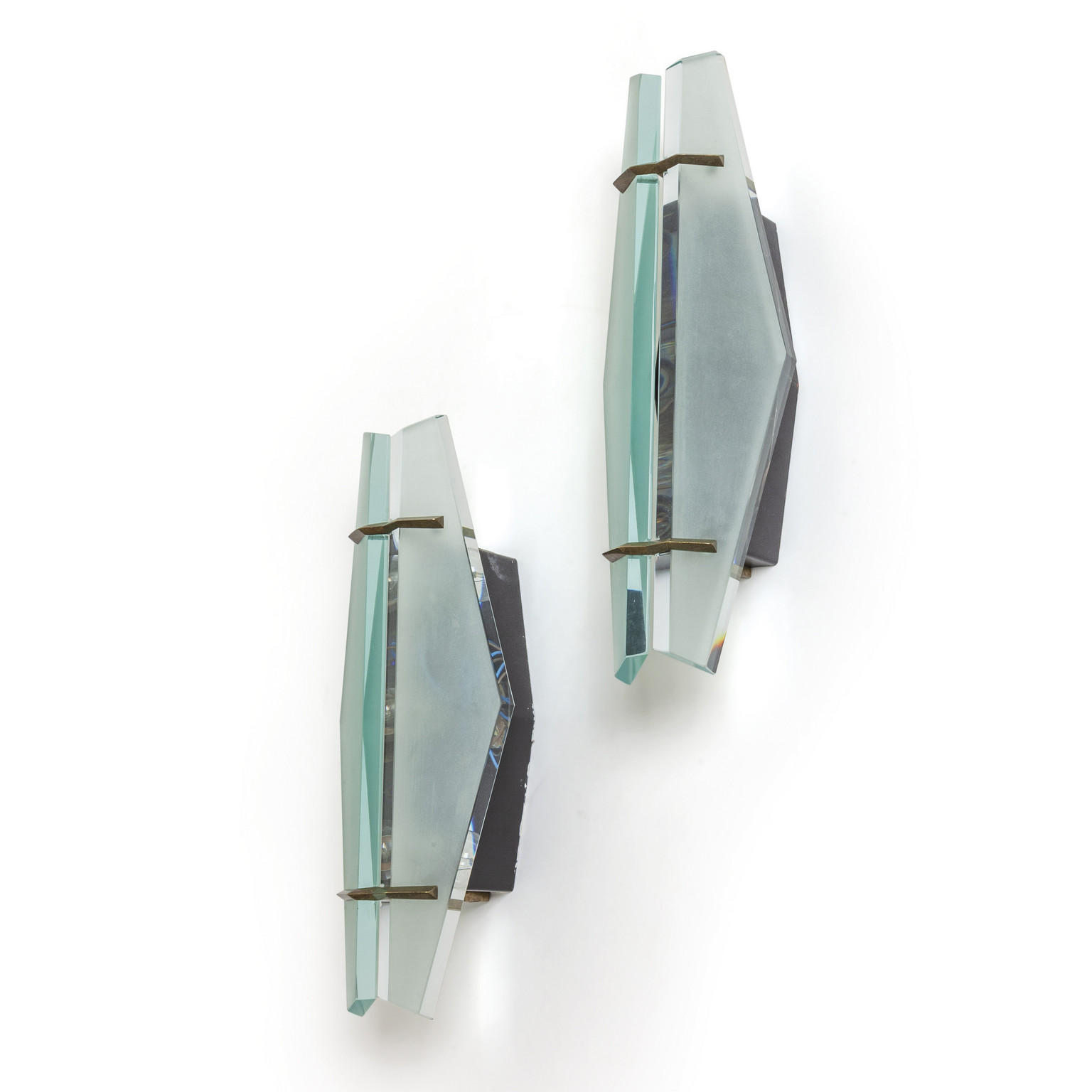Satin finished bevelled crystal lacquered metal and brass.