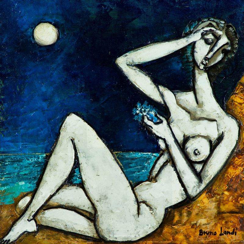 Bruno Landi Romantico notturno, 1998 Olio su tela, cm. 40x40 Firmato in basso a destra. Sul verso: scritto di Autenticità dell'Artista con dedica a persone. Autentica dell'Archivio Generale su foto, con firma dell'Artista e Archivio n° 0905 - 2004.