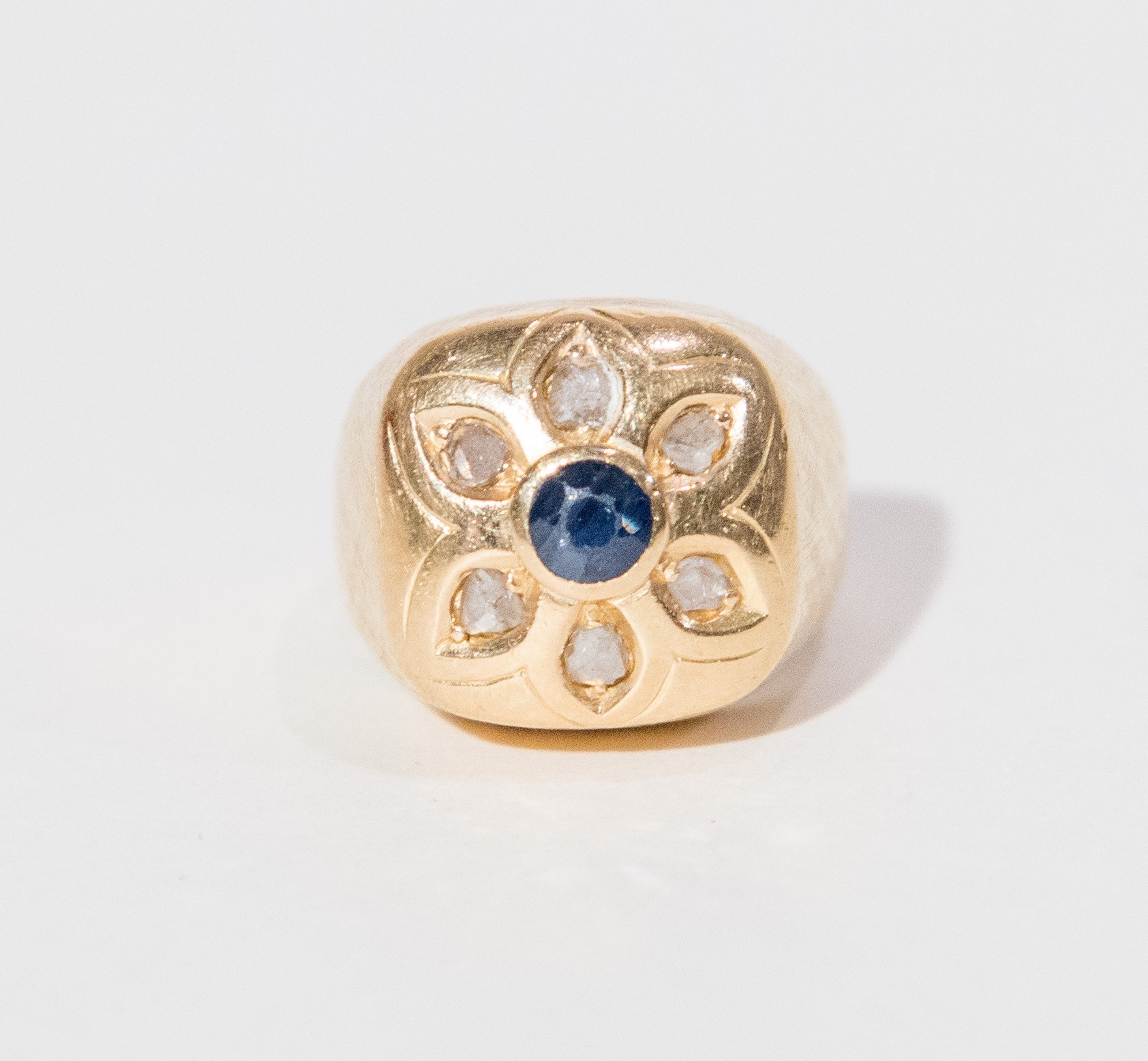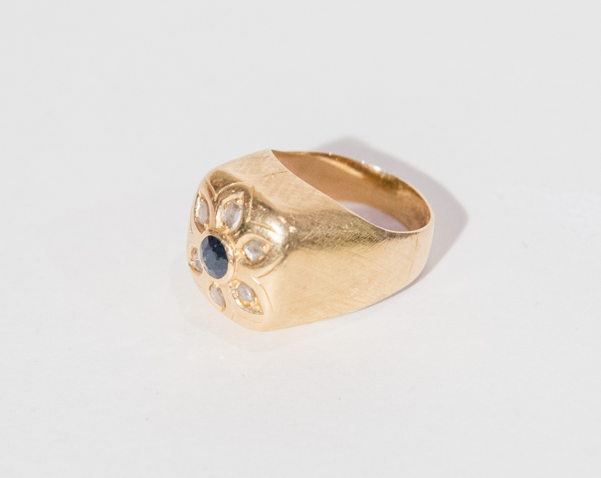 ANELLO A SCUDO IN ORO 18K A lavorazione damascata decorata con zaffiro blu e piccole rose di diamante. Peso complessivo 11,13 grammi.