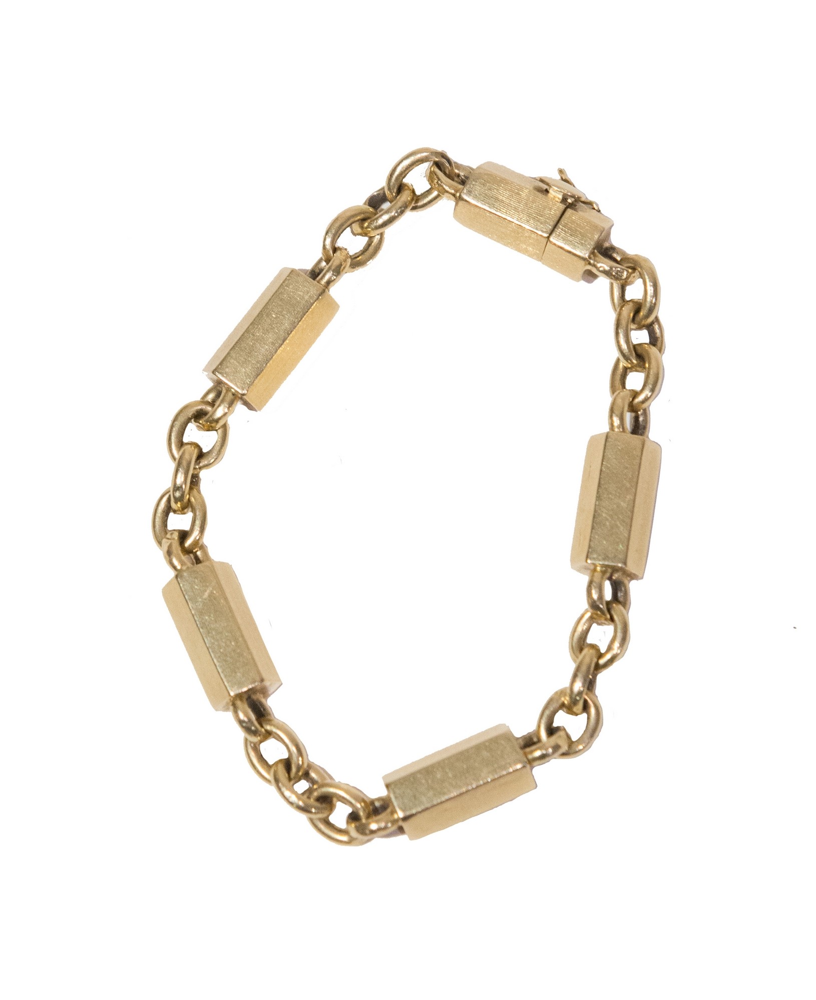 BRACCIALE IN ORO GIALLO 18K Realizzato da catena alternata a piccoli lingotti poligonali . Peso complessivo 31,87 grammi.