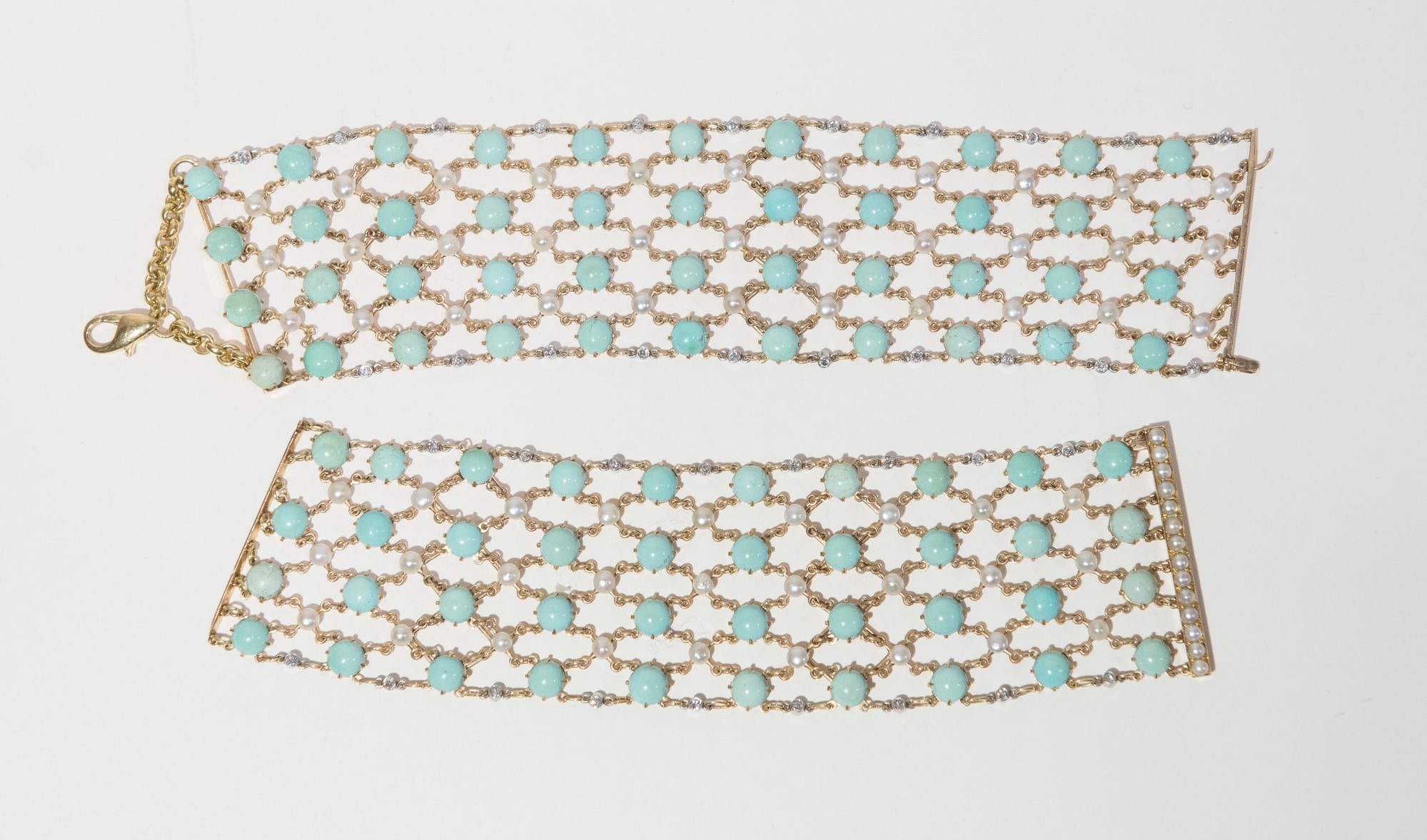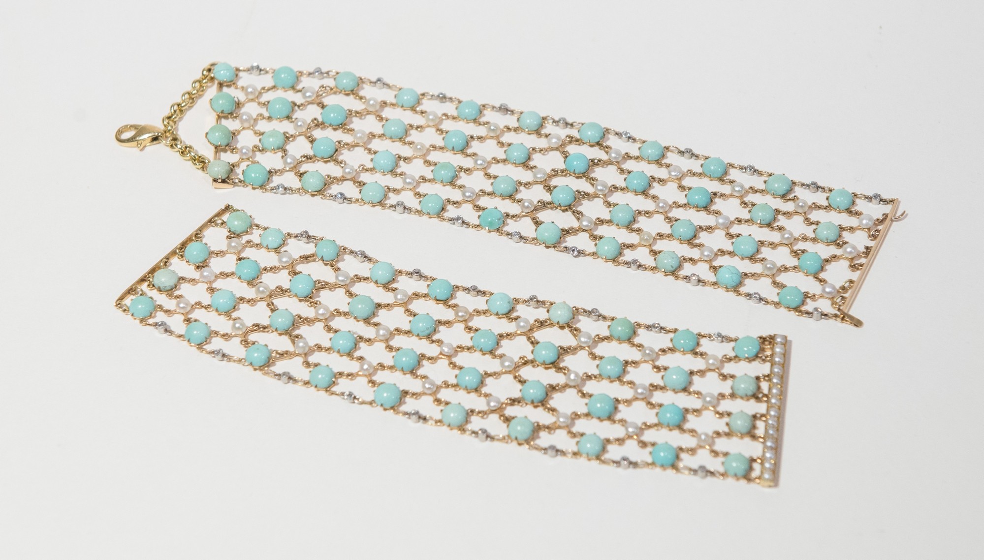 COLLIER IN ORO A BASSO TITOLO Realizzato a quattro file di cabochon circolari di turchese intercalati a piccole perle e diamanti di vecchio taglio. Peso complessivo 95,70 grammi.