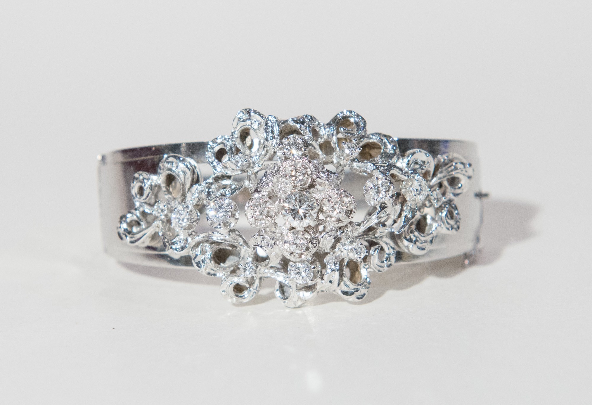 BRACCIALE RIGIDO IN ORO BIANCO 18K Decorato sommitalmente da formella oblunga con corolla di brillanti posti entro festoni analogamente decorati. Peso indicativo diamanti 1.75 carati. Peso complessivo 44,34 grammi grammi.