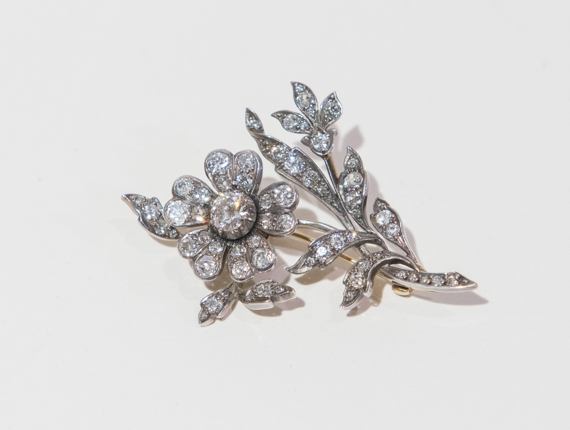 SPILLA ANTICA IN ARGENTO E ORO A BASSO TITOLO Fine XIX secolo, realizzata come un tralcio fiorito interamente decorato con diamanti di vecchio taglio. Peso indicativo diamanti 3.40 carati. Peso complessivo 14,31 grammi.