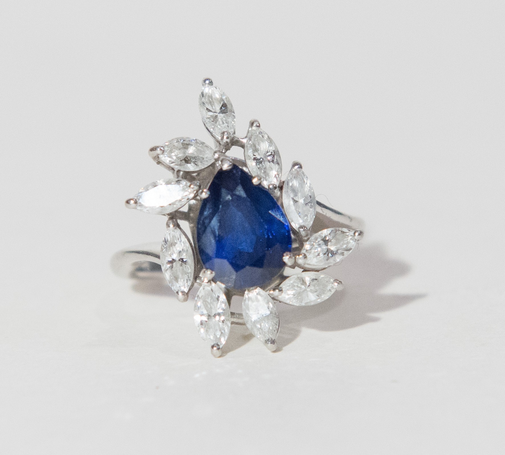 ANELLO IN ORO BIANCO 18K Realizzato con zaffiro blu a goccia posto entro corolla di navette di diamante. Peso indicativo diamanti 1.50 carati. Peso indicativo zaffiro 3.00 carati. Peso complessivo 8,34 grammi