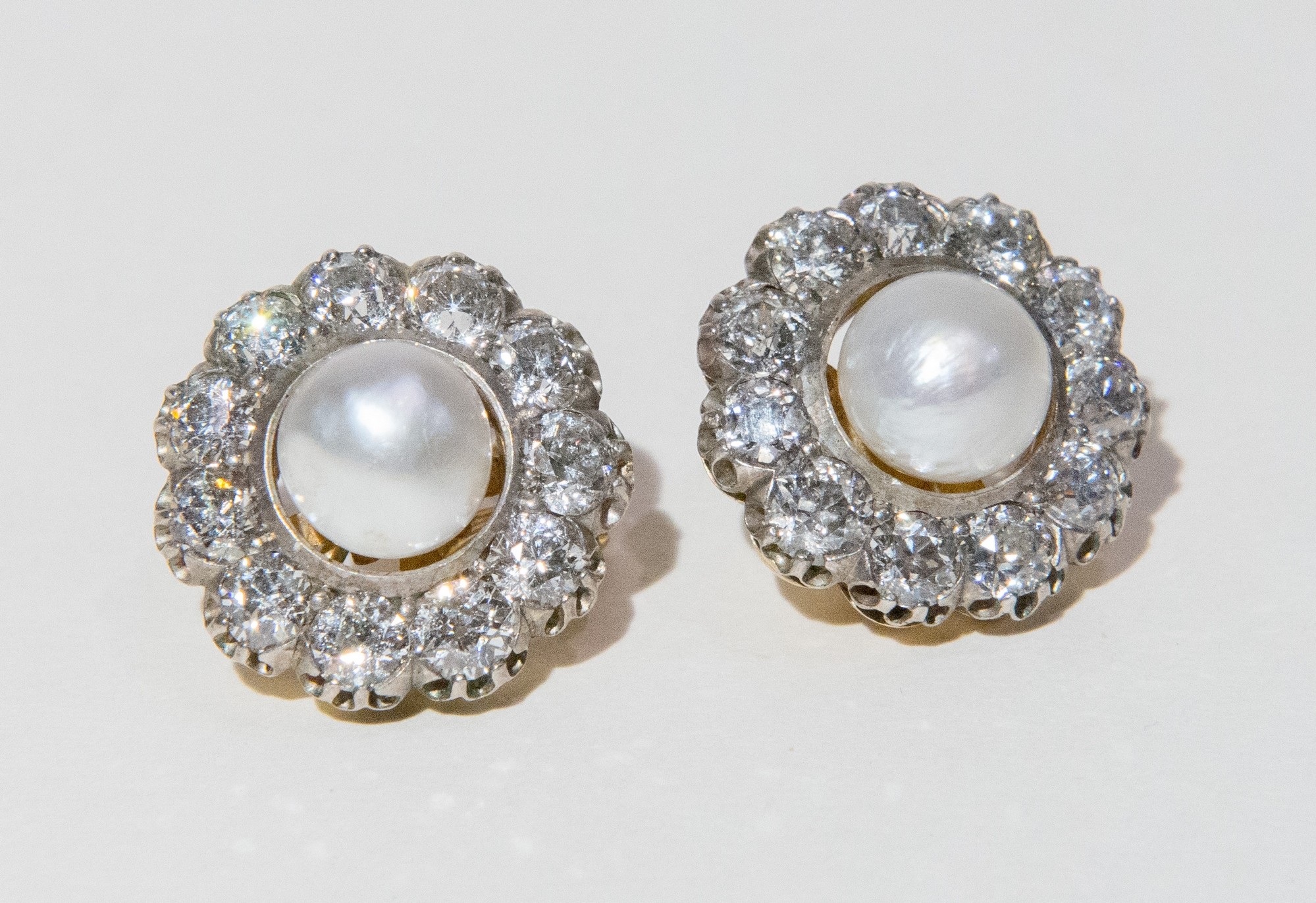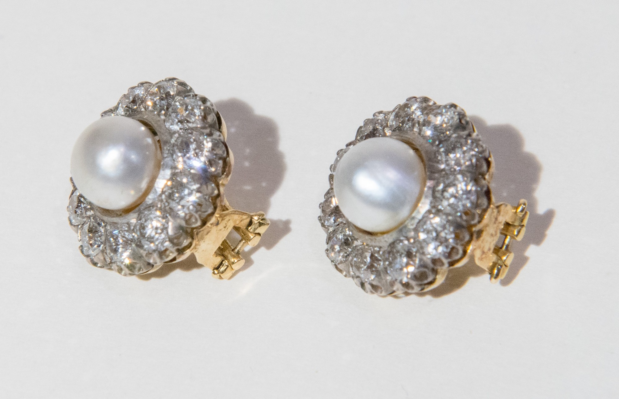 ORECCHINI IN ORO Ciascuno realizzato come una clip con perla semisferica centrale posta entro cornice di diamanti di vecchio taglio. Diamanti 5.70 carati. Perle 8.4-8.8 mm. Peso complessivo 12,9 grammi.