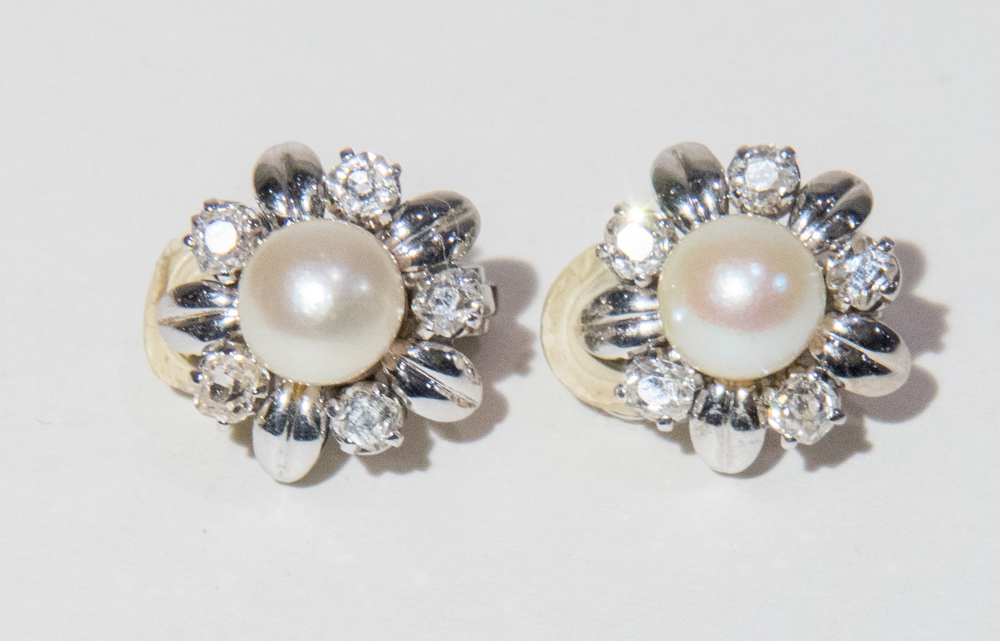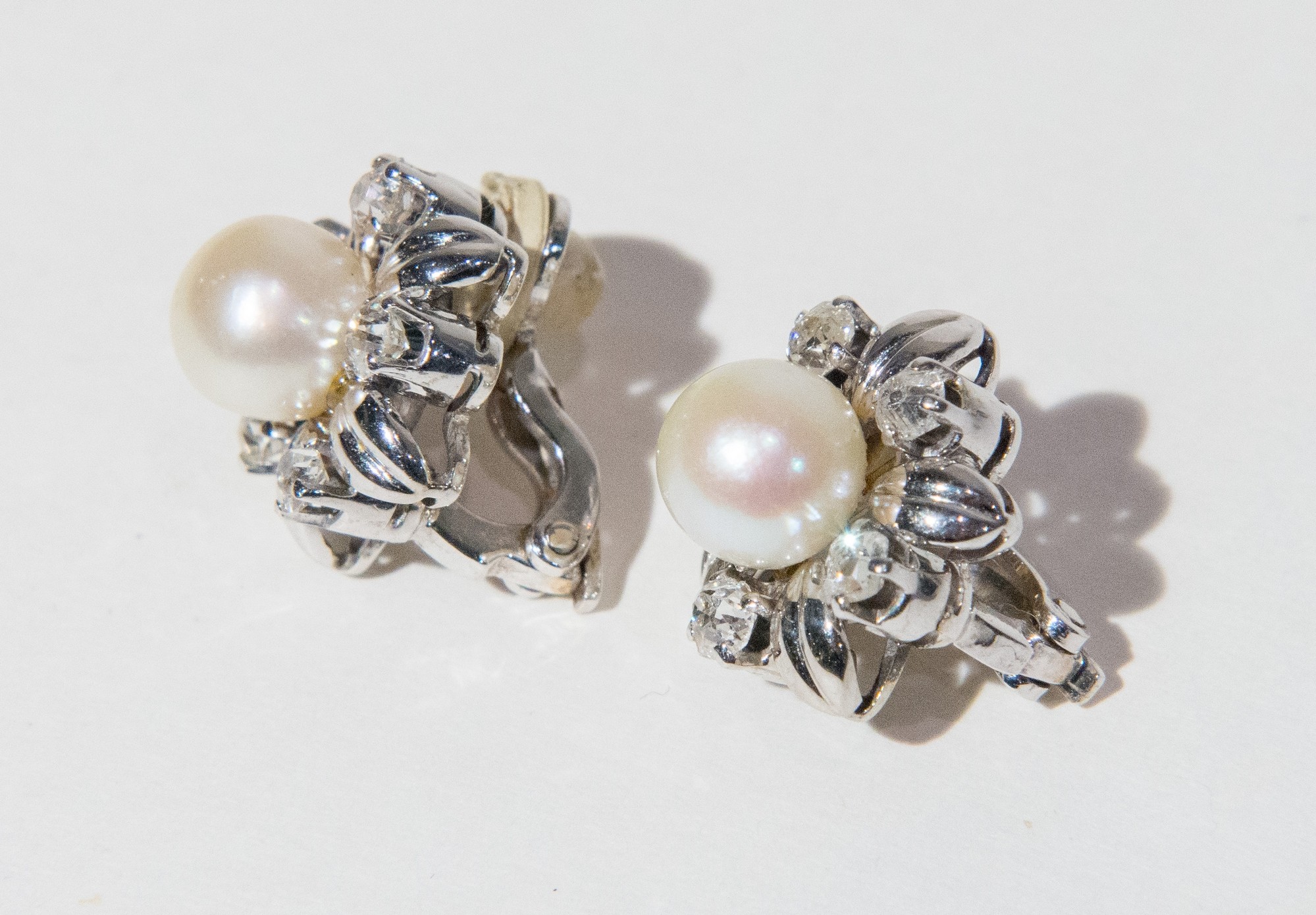 ORECCHINI IN ORO BIANCO 18K Ciascuno realizzato come una clip a lobo con perla coltivata sferica centrale e cornice di 5 diamanti di vecchio taglio intercalati a elementi vegetali stilizzati. Diamanti 1.30 carati. Perle 7.6-8.0 mm. Peso complessivo 10,00 grammi.
