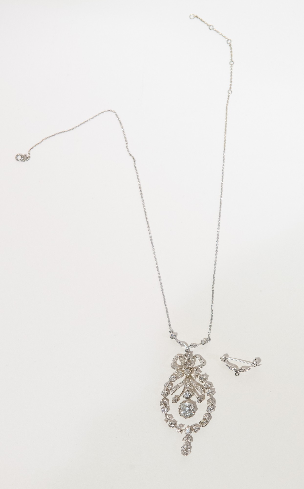 COLLANA IN ORO BIANCO CONVERTIBILE A SPILLA Realizzata con catena sottile ed elemento centrale decorato ad elementi di guisa vegetale e centrato da grande diamante di vecchio taglio. Inizi XX secolo. A corredo accessorio che permette di utilizzare la formella centrale come spilla. Diamante centrale 3.10 carati circa K-L VS2. Altri diamanti escluse rosette 2.70 carati. Peso complessivo 15,6 grammi.