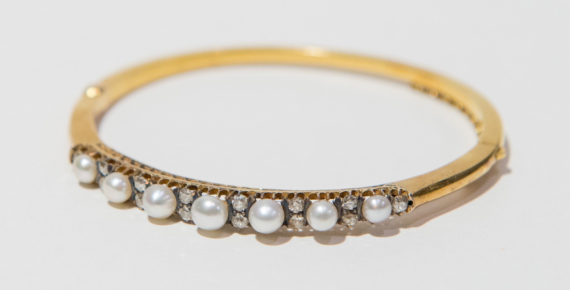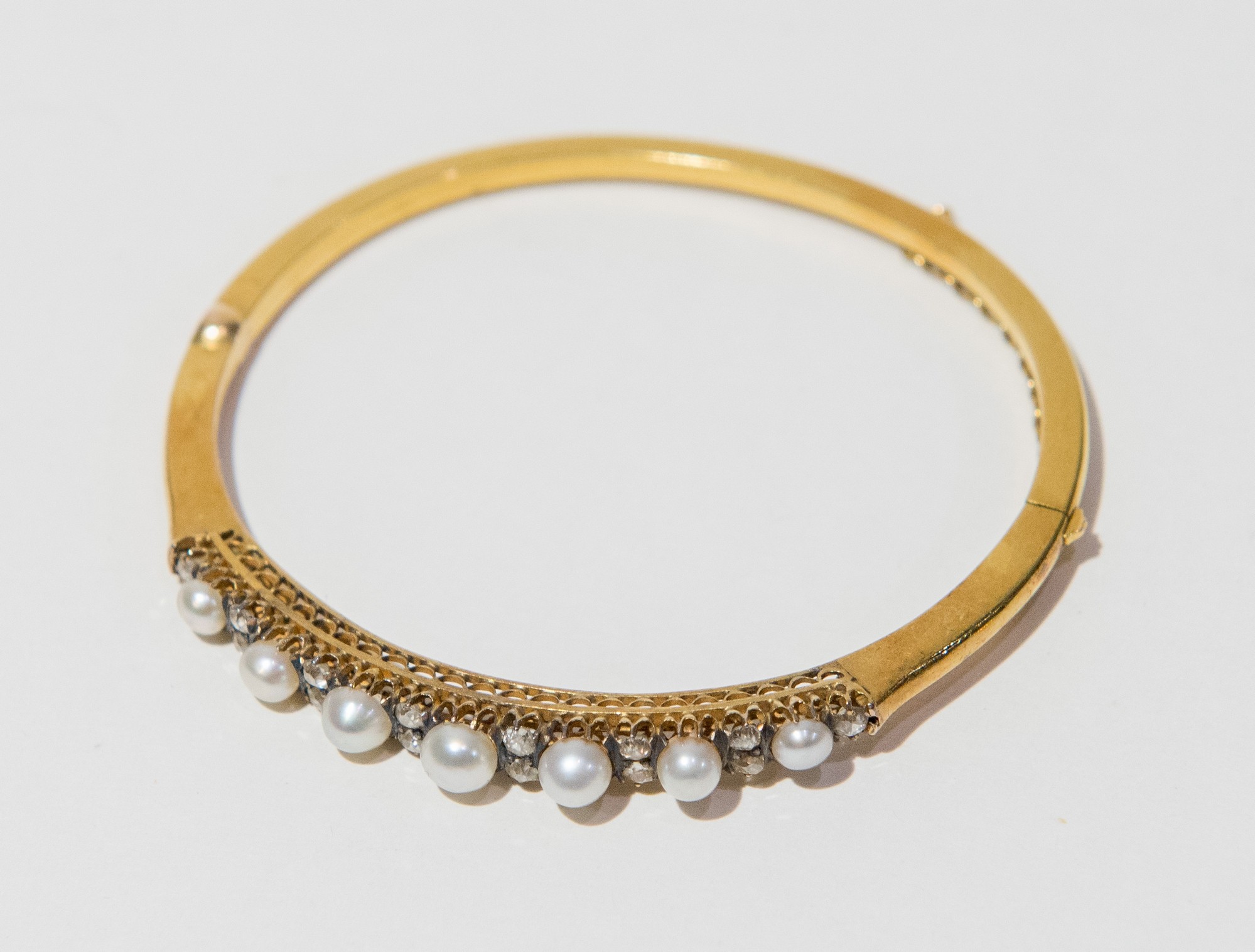 BRACCIALE IN ORO GIALLO E ARGENTO Realizzato come un cerchio rigido decorato sommitalmente da una fila di sette perle (diametri tra 4 e 5 mm) intercalate da diamanti di vecchio taglio. Diamanti 1.0 carato circa. Peso complessivo 12,48 grammi.