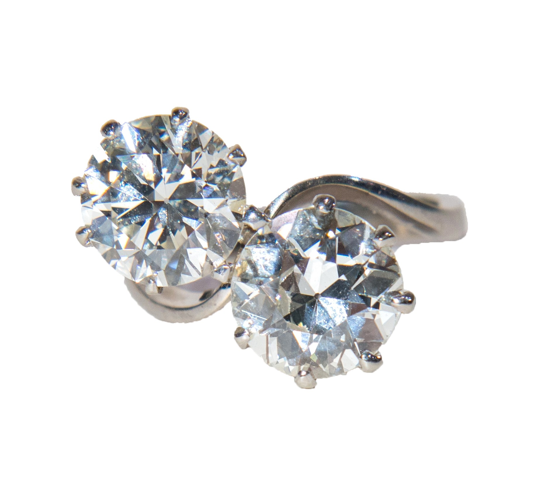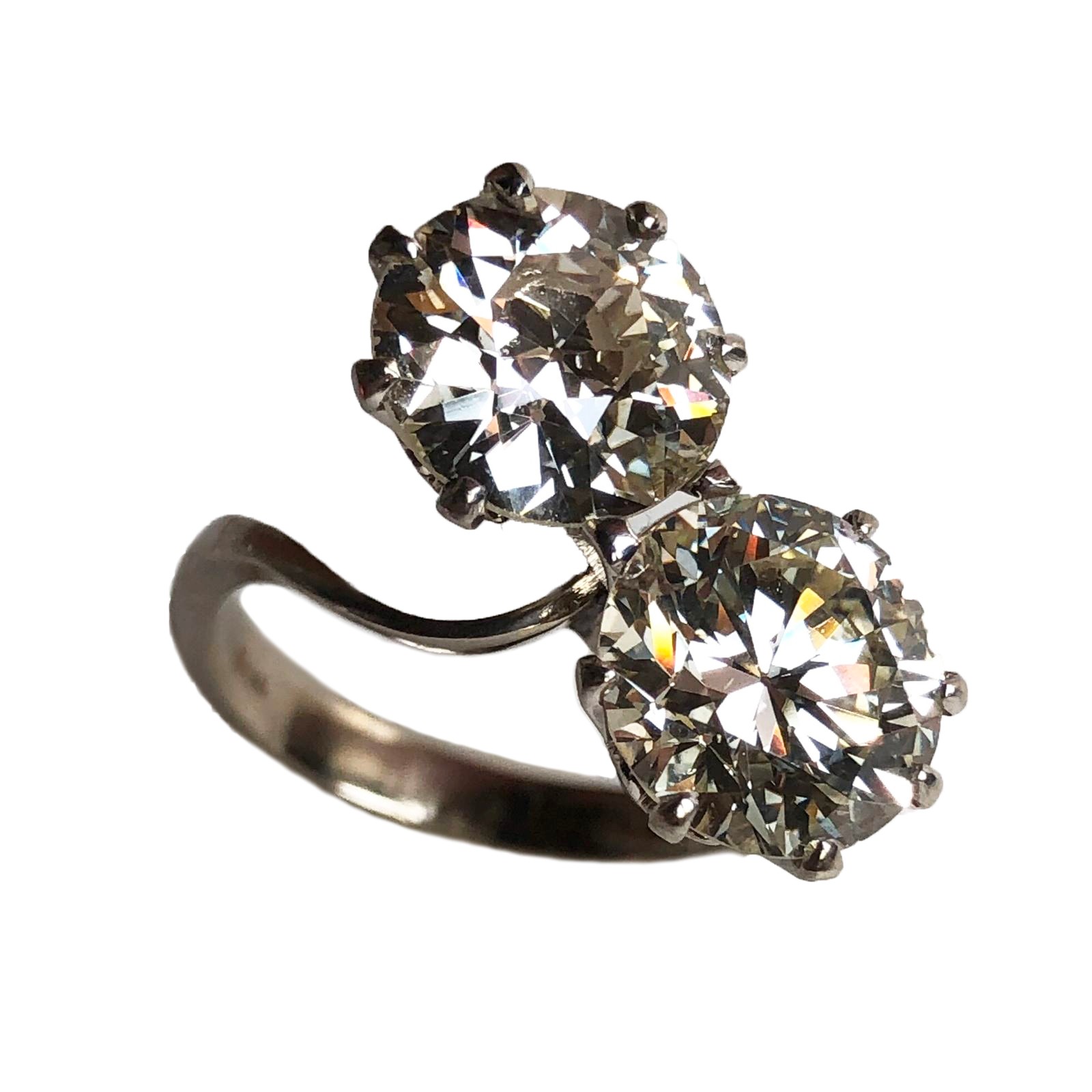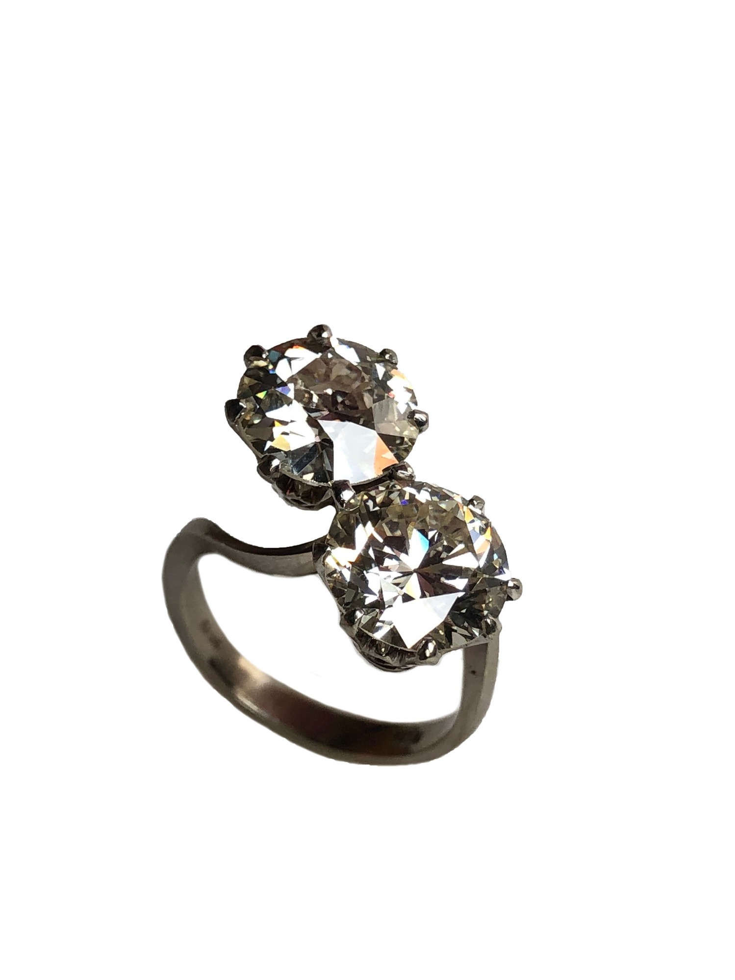 IMPORTANTE ANELLO IN ORO BIANCO 18K Realizzato come un contrarié recante agli apici due grandi diamanti. Dia1 TV 3.45 carati K-L VS2. Dia2 RBC 3.65 carati K-L VS1. Peso complessivo 7,00 grammi.