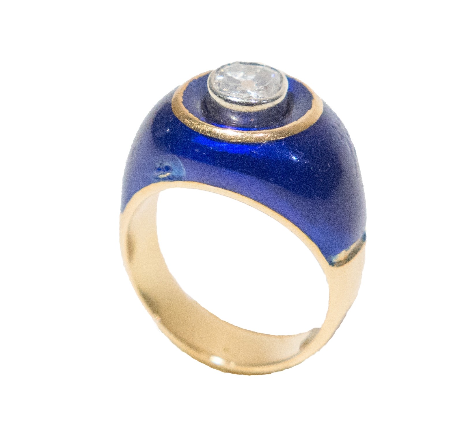 ANELLO IN ORO GIALLO 18K SMALTATO Realizzato come una fascia decorata con smalto blu e centrata da diamante e cuscino di vecchio taglio. Peso complessivo 11,89 grammi. (Difetti)