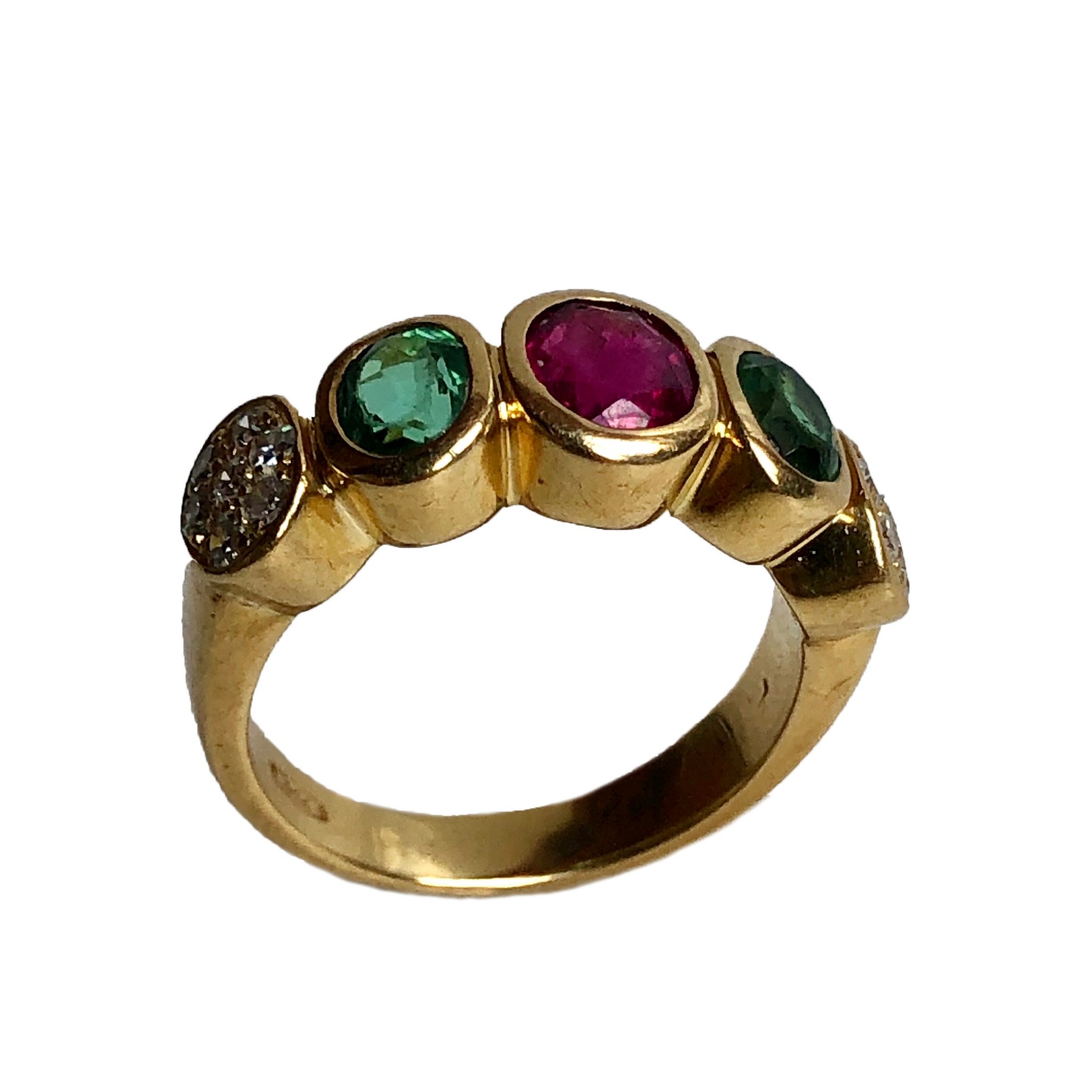 ANELLO IN ORO GIALLO 18K Realizzato ad una fila di elementi ovali contenenti tormaline verdi e rosa e piccoli diamanti di taglio singolo. Peso complessivo 9,90 grammi.