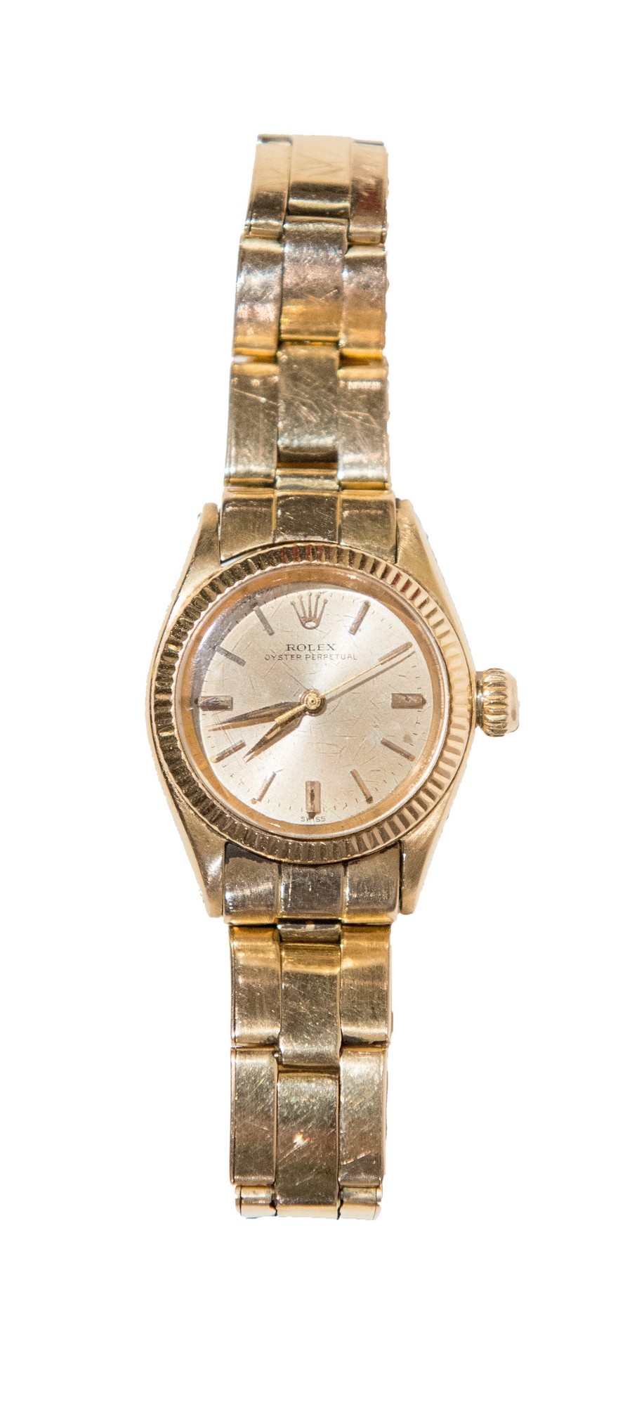 OROLOGIO DA POLSO ROLEX Modello Oyster Perpetual per signora, in oro 18K. Cassa con fondello e corona a vite, lunetta godronata, vetro plastica. Quadrante champagne con indici applicati a bastone, lancette a foglia. Movimento a carica automatica. Bracciale a maglie Oyster rivettate digradanti in oro giallo, chiusura Deployante. Diametro 26mm. (Da revisionare)
