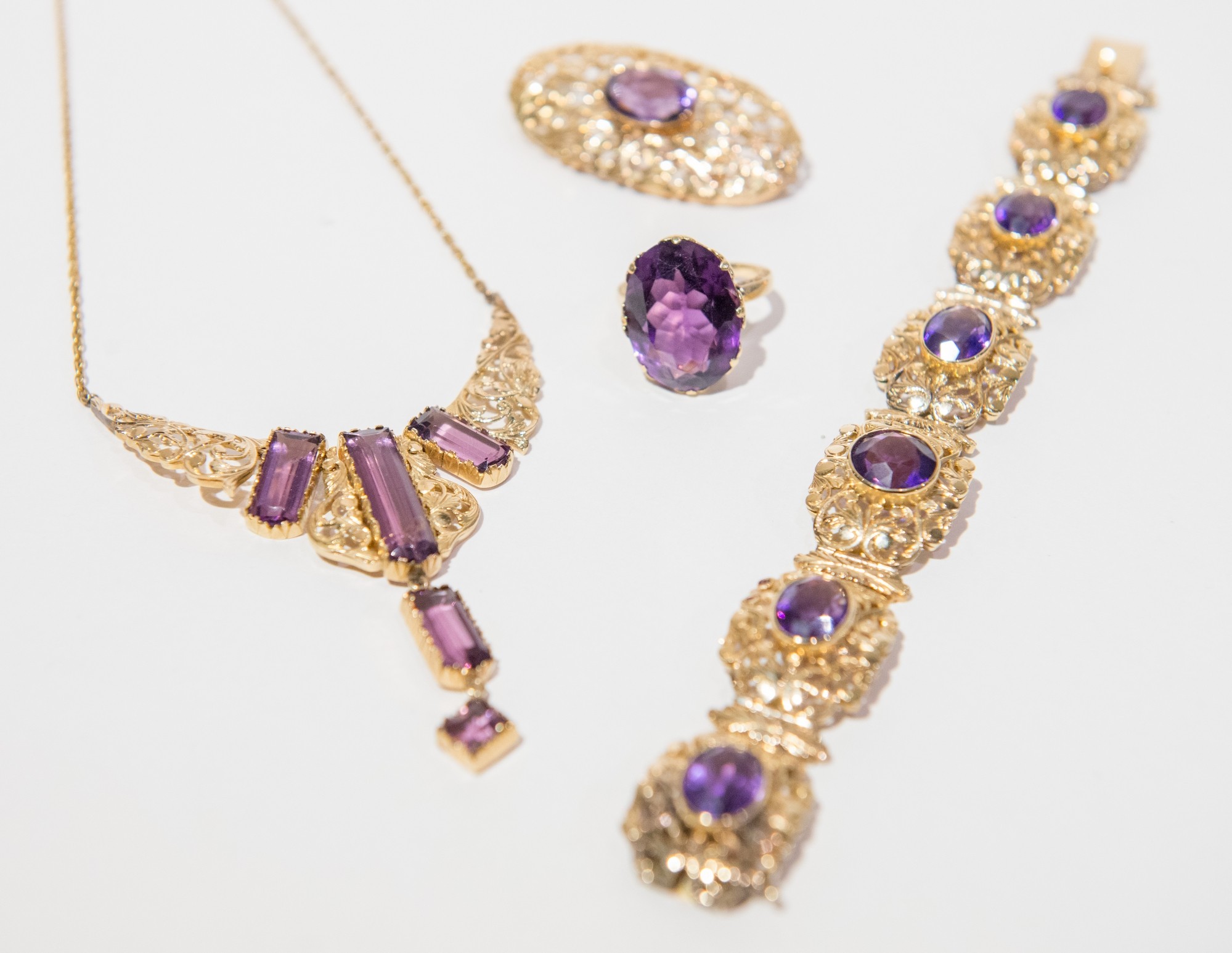 PARURE AMETISTE Composta da collana, bracciale, spilla e anello. Ciascun elemento è realizzato in oro giallo 18K inciso, traforato e decorato con ametiste naturali di taglio composito e a gradini. Peso complessivo 88,30 grammi. Una delle ametiste reca difetti.
