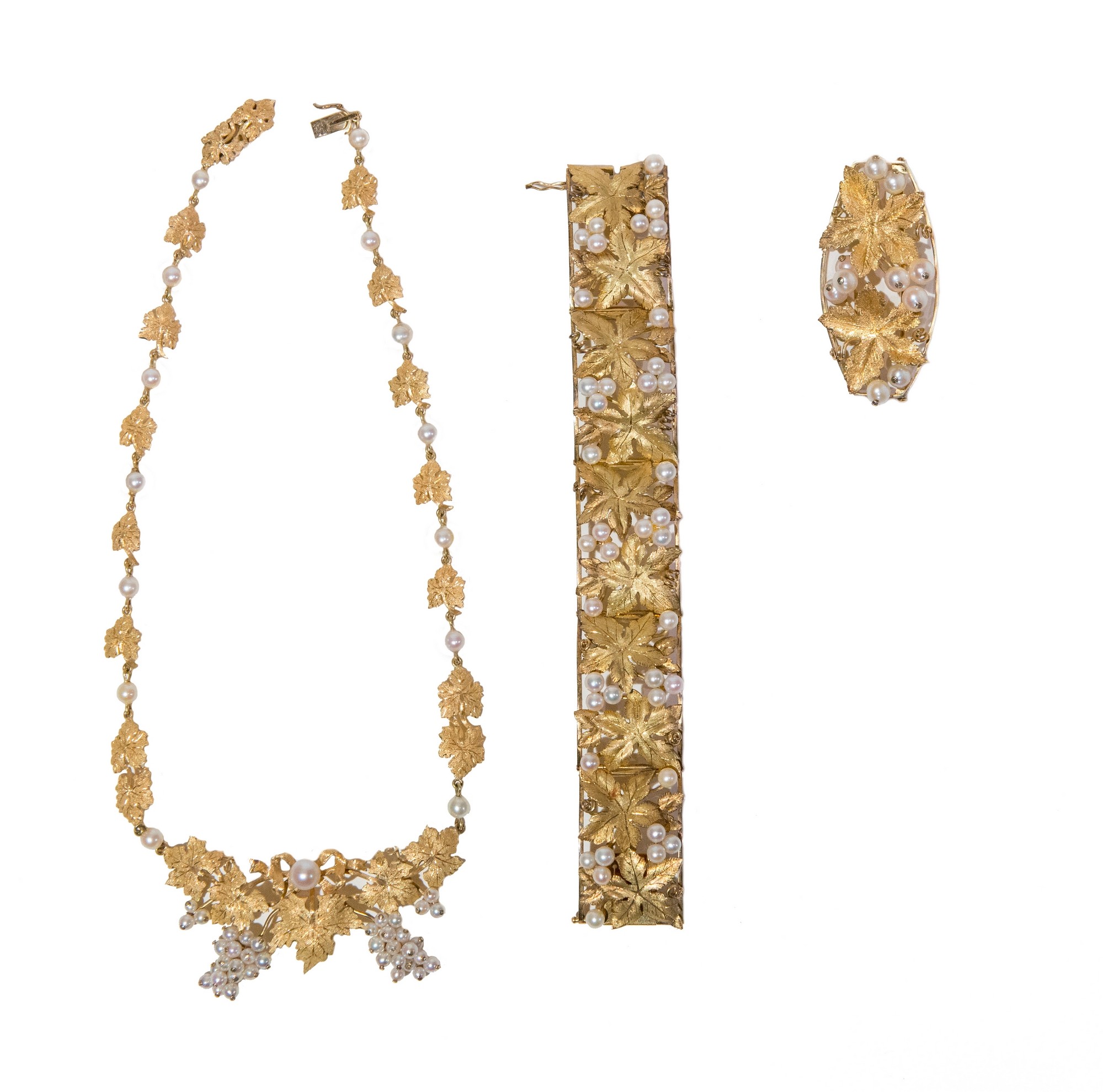 PARURE UVA Composta da collana, bracciale e spilla. Ciascun elemento è realizzato in oro giallo 18K modellato a guisa di foglie di vite e decorato con elementi a grappolo d’uva in perle coltivate. Peso complessivo 120,86 grammi.