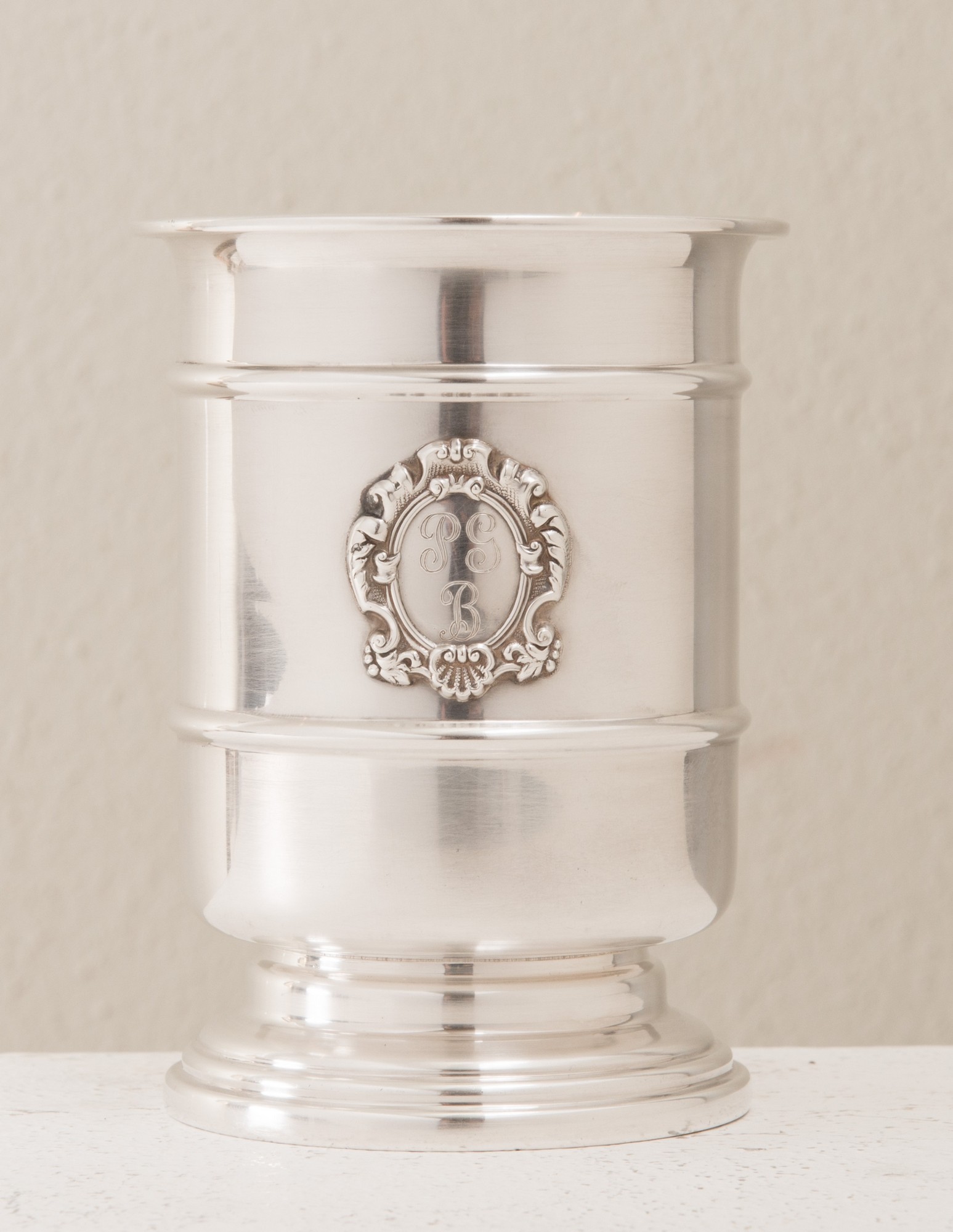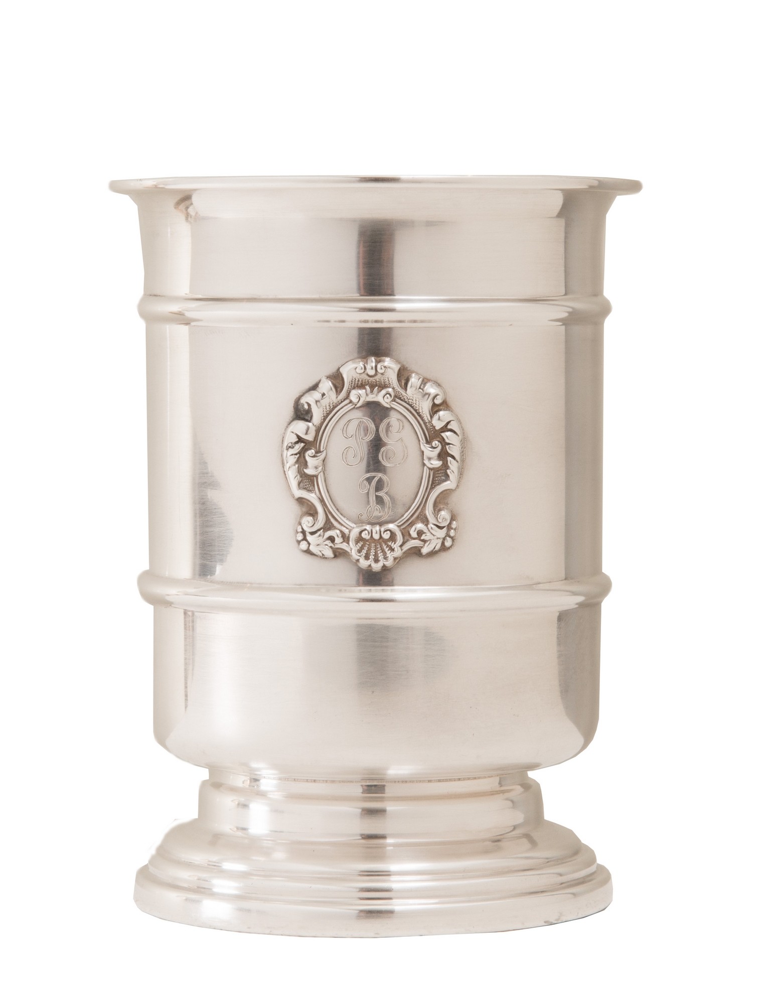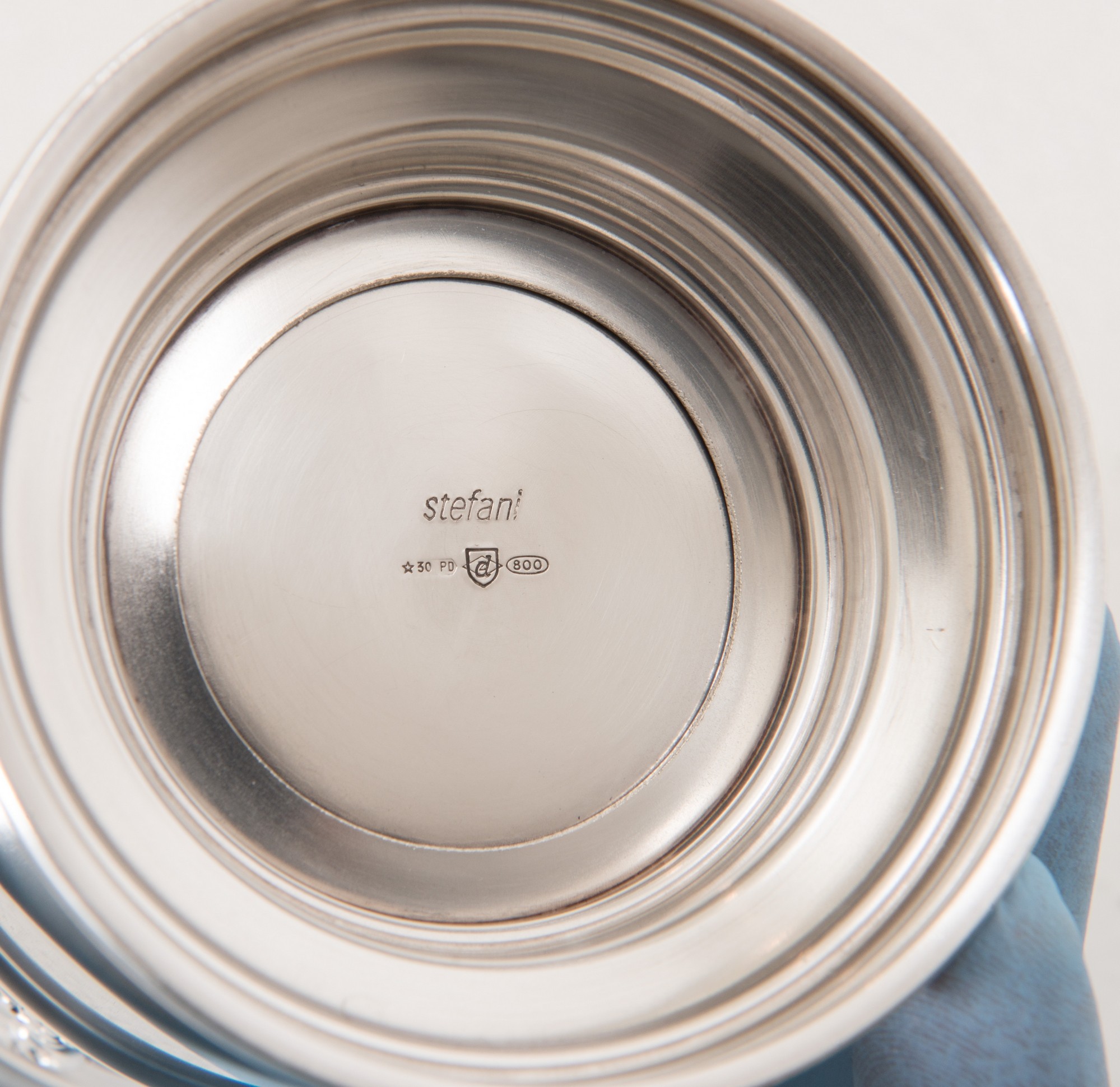 ARGENTERIA e OREFICERIA STEFANI, XX secolo Bicchiere portapenne in argento, con disegno originale Stefani. Corpo cilindrico ornato da stemma P.G.B. Accompagnato da garanzia di provenienza Stefani. Peso: 183 gr. Cm 12; Diametro: Cm 9. Sotto la base reca marchio Stefani e punzonatura: 30PD-Z-d-800.
