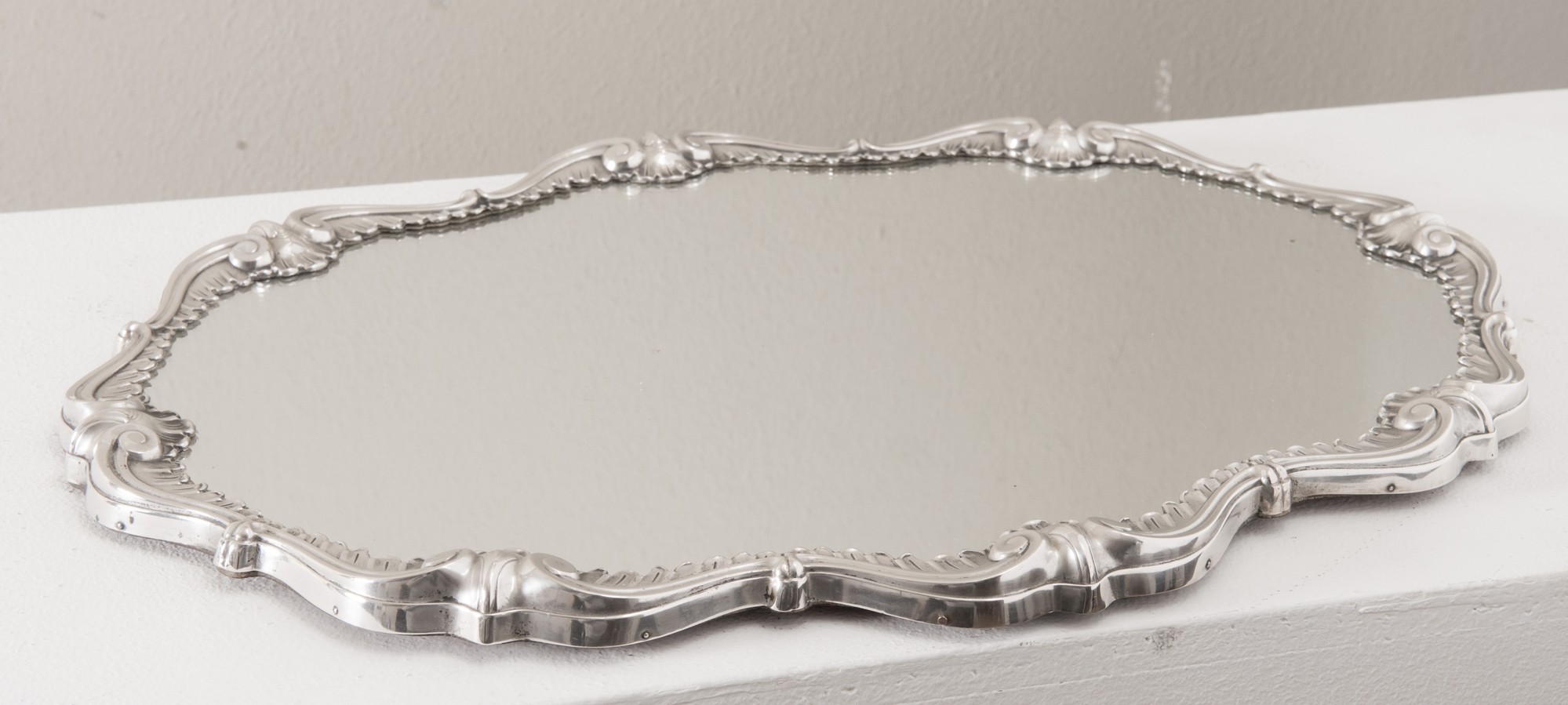 VASSOIO SPECCHIERA IN ARGENTO Di forma ovale con sagomatura mistilinea e decorazione a volute. Il piano di appoggio è formato da uno specchio. Il retro è in legno scuro, su cui vi sono montati quattro piedini di appoggio rotondi. Reca punzoni sul bordo della cornice. Cm 38,5x5x2,5.