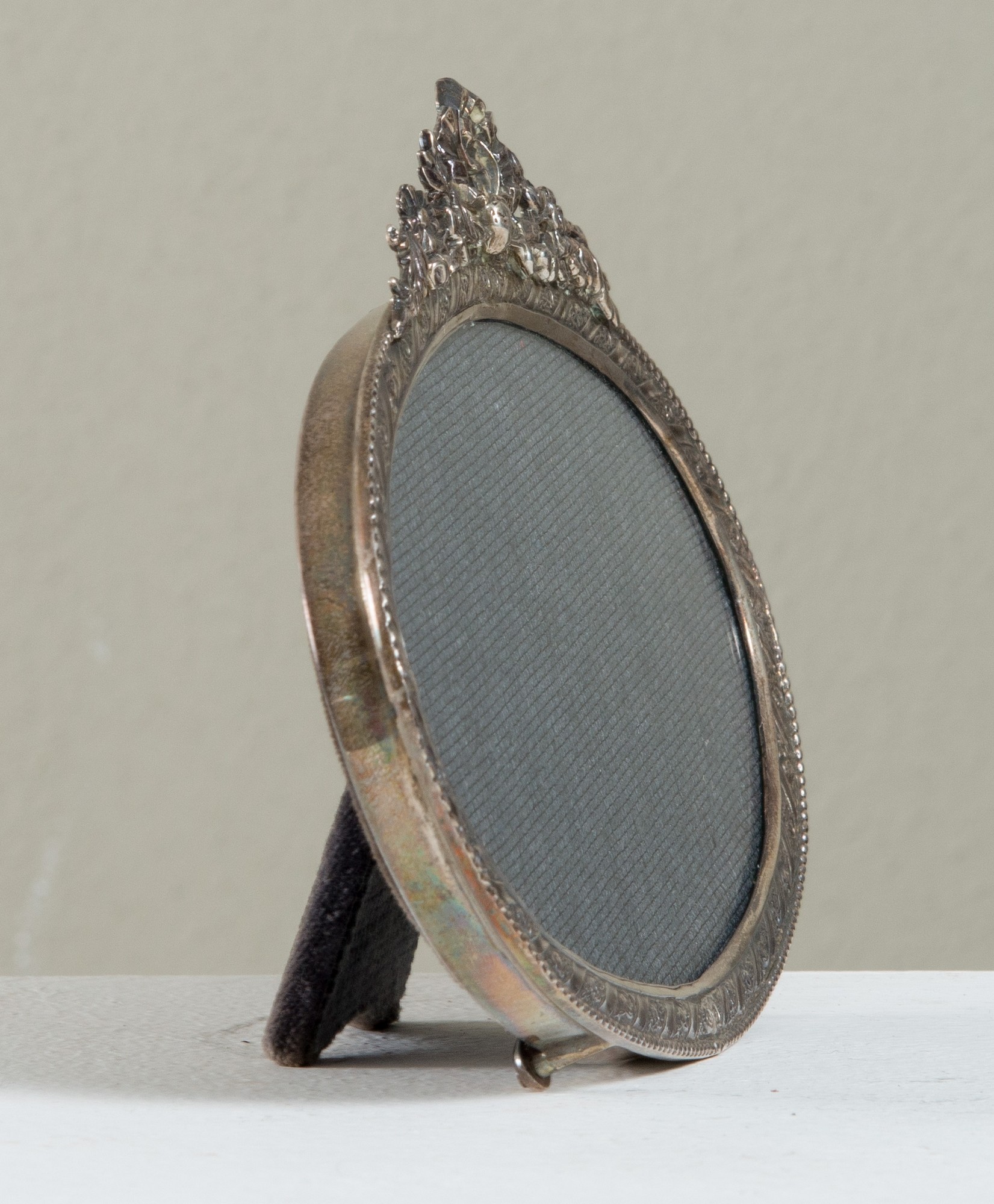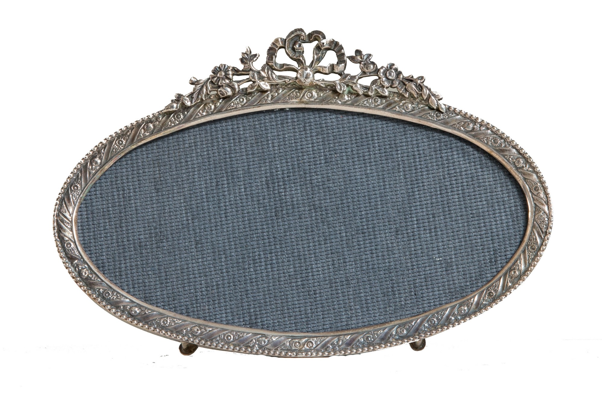 BELFIORE, Firenze dal 1948 Cornice a forma ovale in argento sbalzato con motivi floreali, decorata in alto con un fiocco. Reca alla base incisione Belfiore e punzone 925. Cm 12x17,5x1.