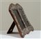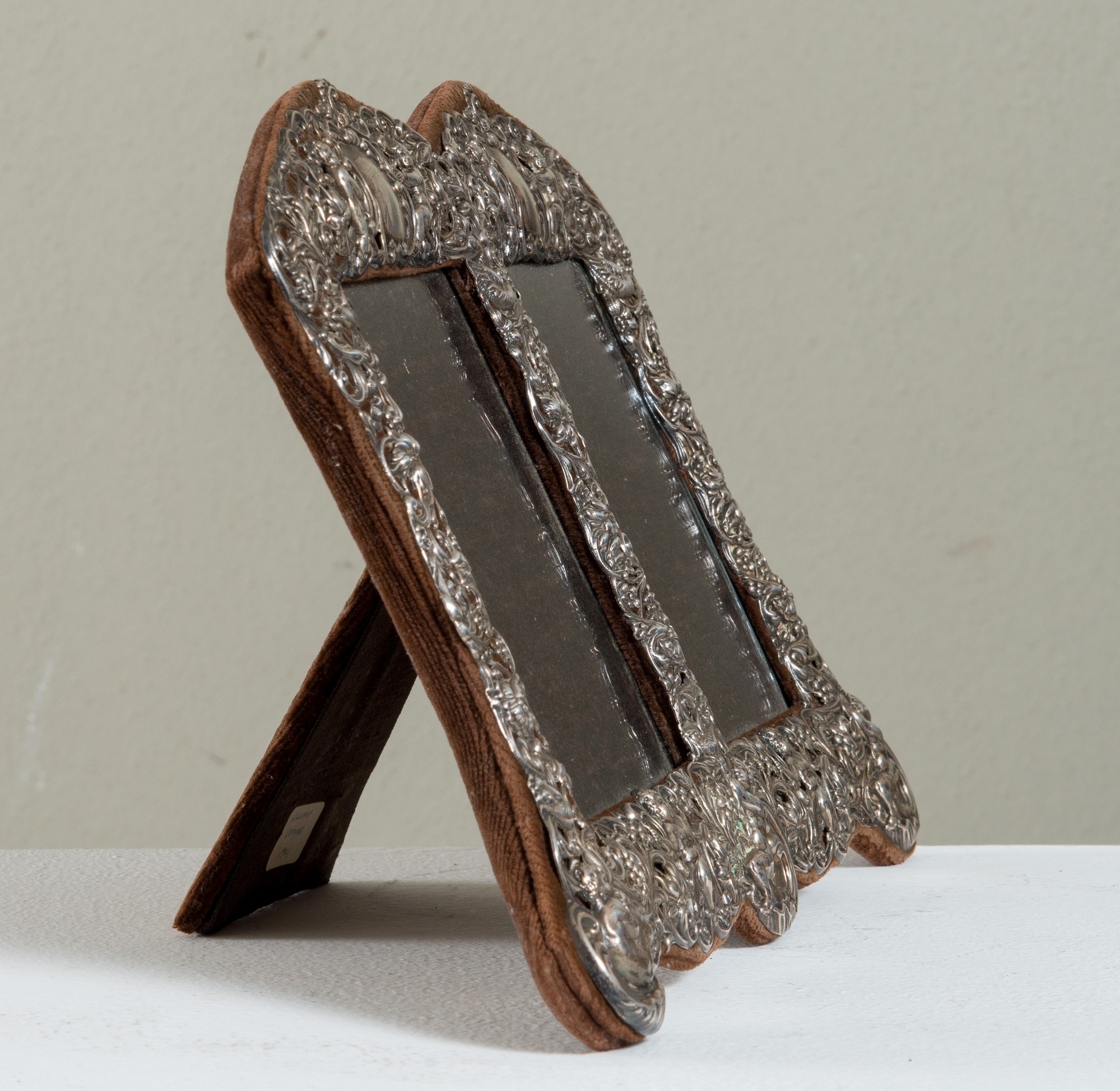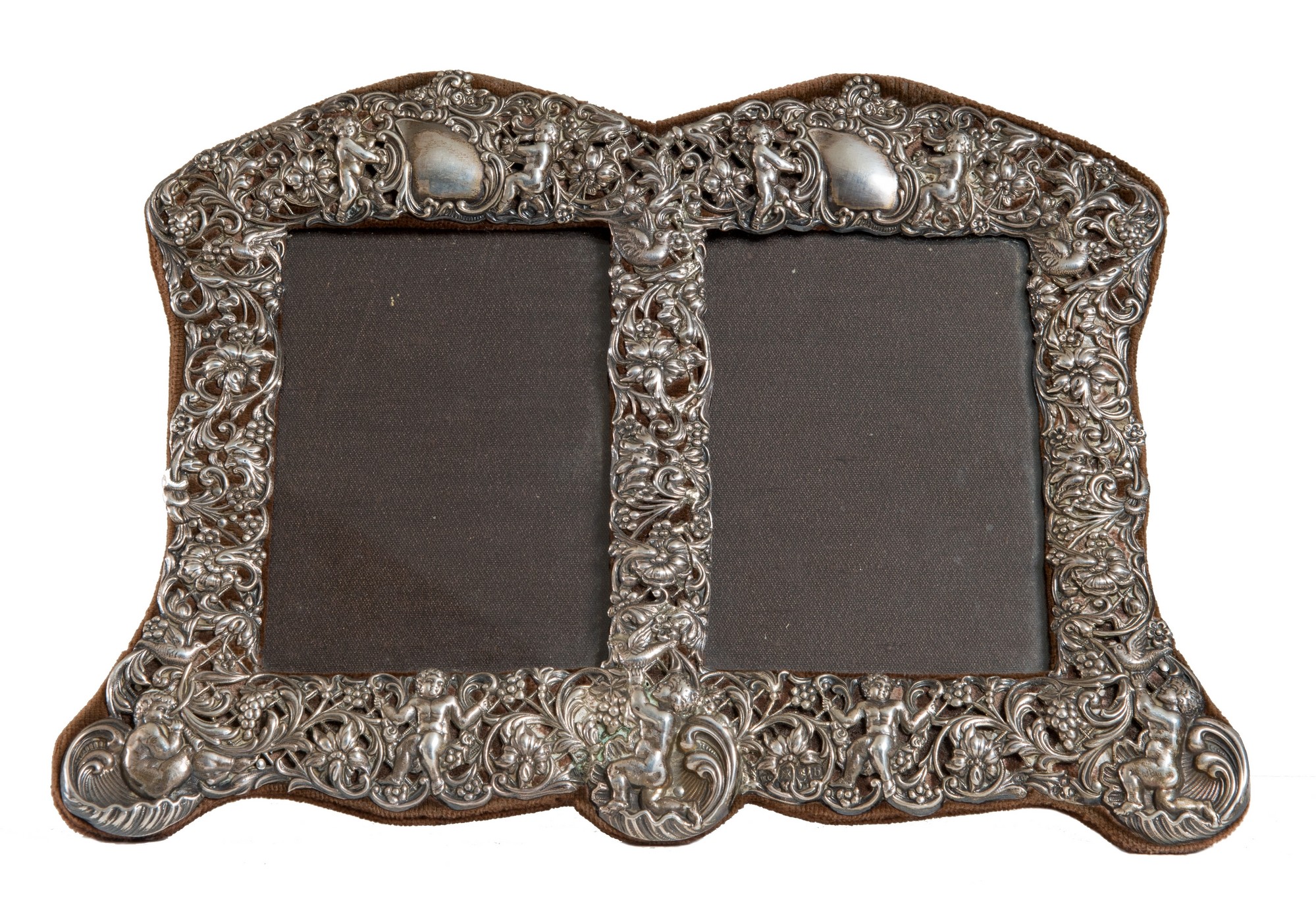 WILLIAM COMYNS, Londra, 1897 Databile in epoca vittoriana. Cornice doppia composta da due elementi in argento 925 sbalzato con reticolo, motivi floreali, fogliacei, grappoli di uva, uccelli e nove cherubini in festa con strumenti musicali. Alla base reca sigla e stemmi. Accompagnata da certificato di autenticità di Salvadori Prato. Cm 20x28x1,5.