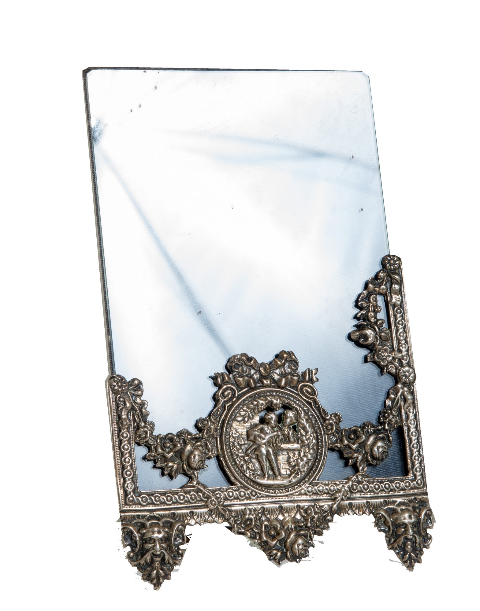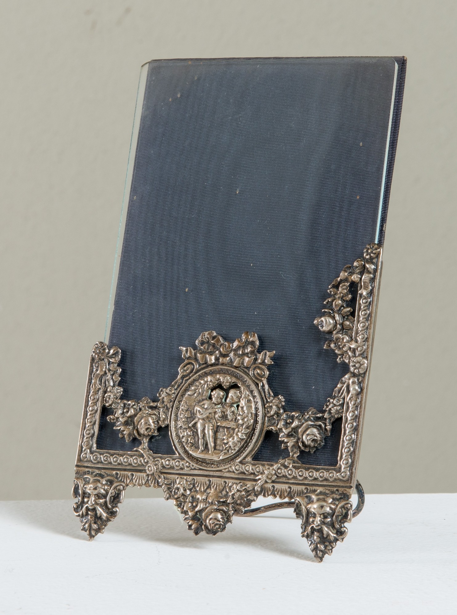 RE. RADDI, Firenze Cornice in argento sbalzato con motivi floreali, fogliacei, fiocchi e due figure in festa con strumenti musicali. Sorretto da due piedini raffiguranti volti e motivi fogliacei. Al retro reca incisione Re. Raddi e punzoni. Cm 17x11x0,8.