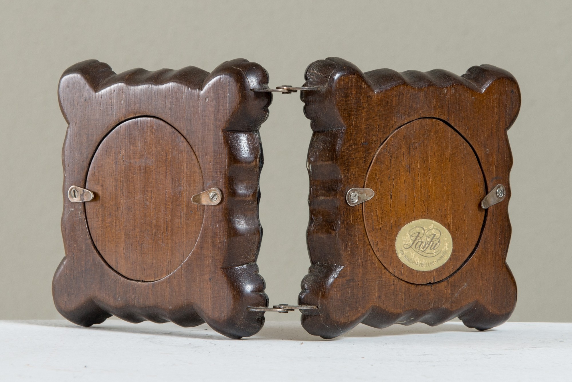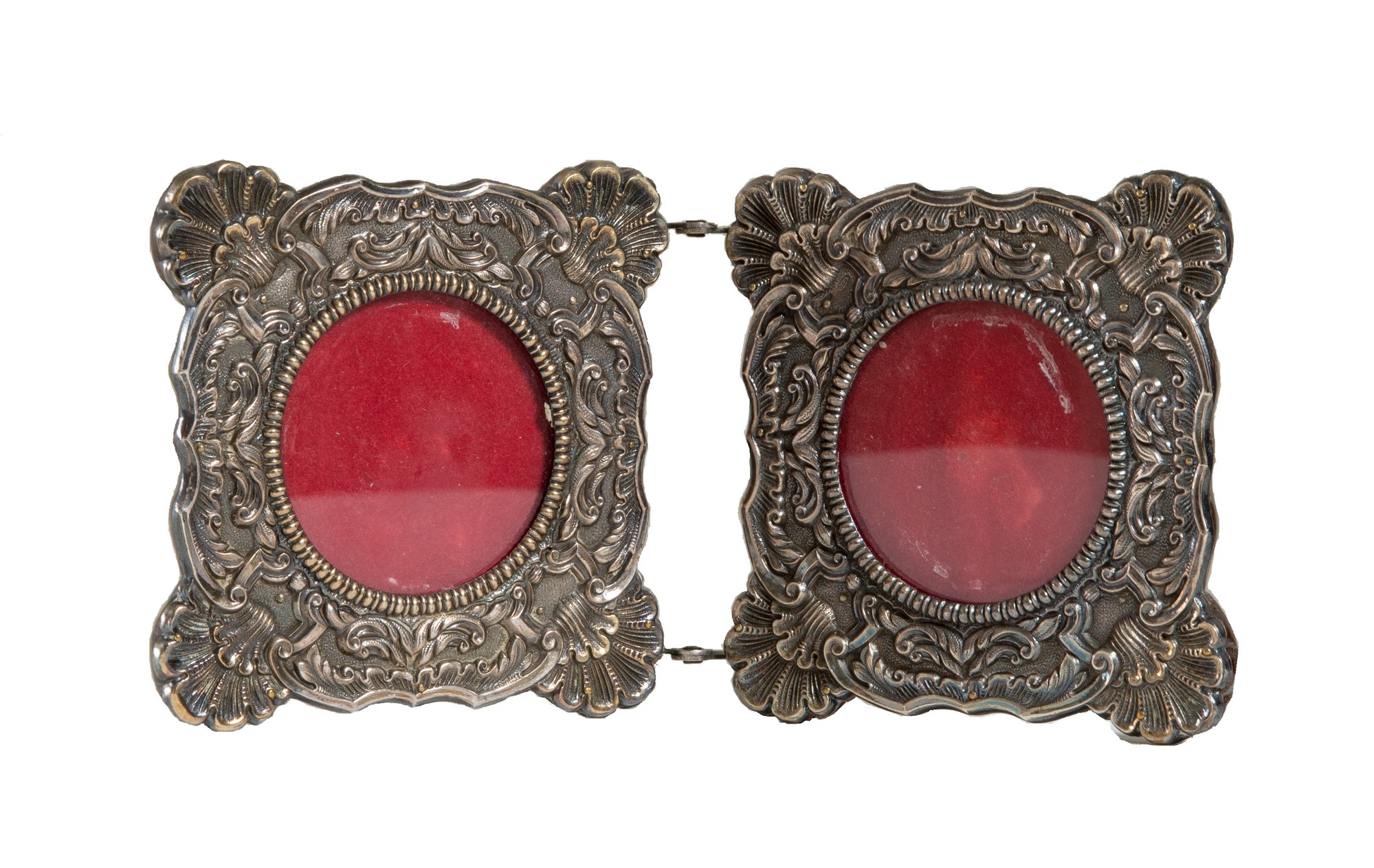 DOPPIA CORNICE in argento Cornice composta da due elementi speculari di forma quadrata uniti da due fascette pieghevoli. Fasce in argento sbalzato con motivi fogliacei, decorate agli angoli con conchiglie. Sul lato sinistro in alto recano entrambi punzoni. Aperto: Cm 9x18,6x1; Chiuso: Cm 9x9x2,2.