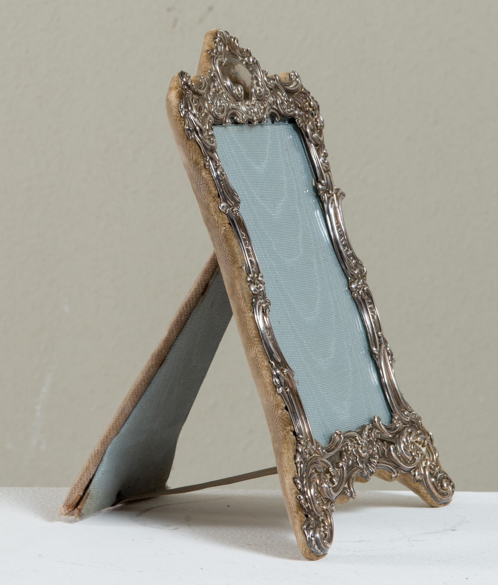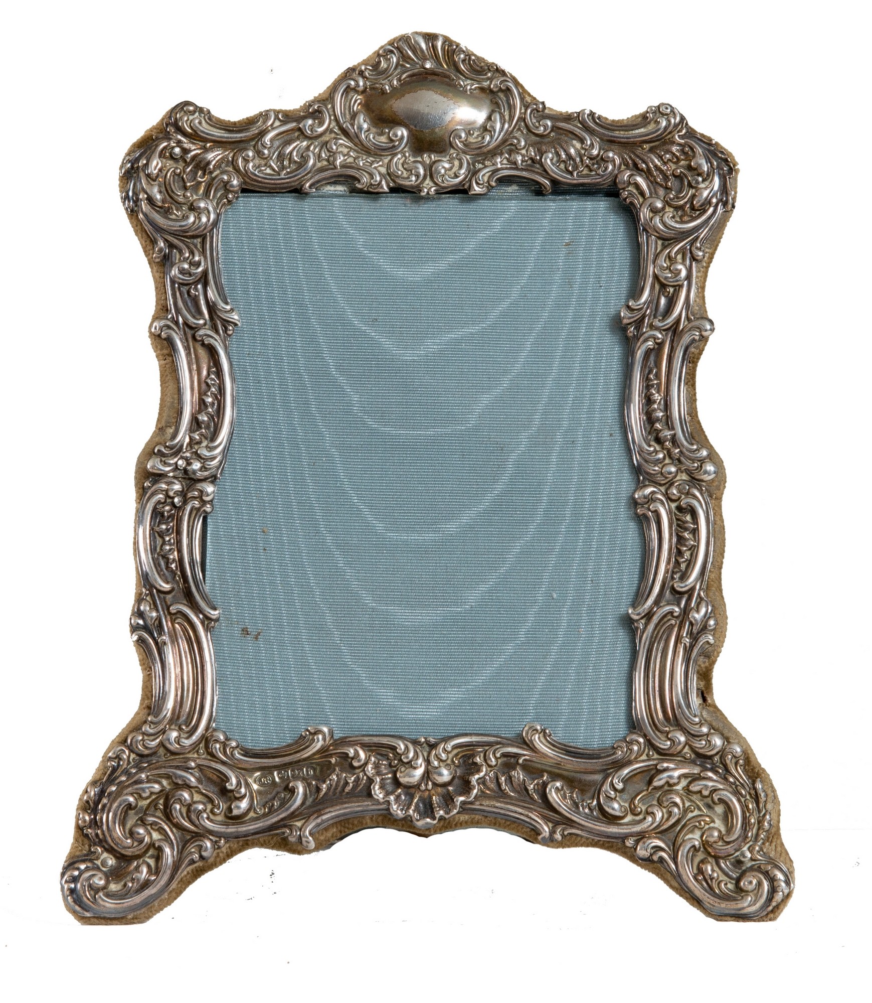 JOHN ROUND. Sheffield, 1900 circa Cornice di epoca vittoriana in argento 925 sbalzato con motivi fogliacei. In basso reca sigla e punzoni Corona, Lion passant. Accompagnata da certificato di autenticità di Salvadori Prato. Cm 18x13x1.