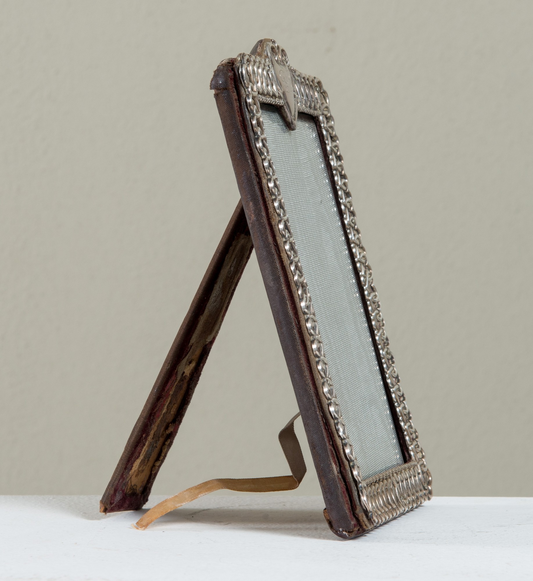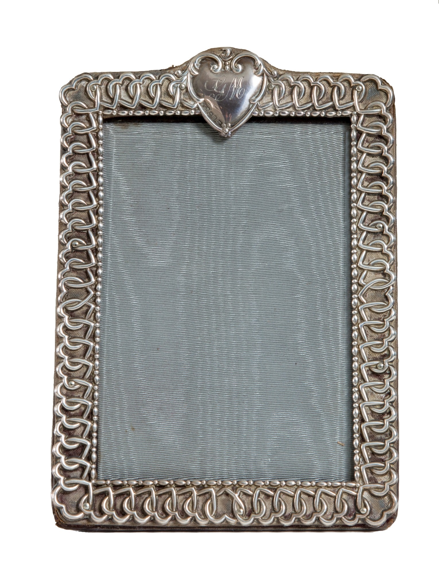 ARGENTERIA BOULSOVER, Birmingham, 1914 Cornice in argento Sterling sbalzato con catena di cuori e sovrastata in alto da un cuore, con incisione G.M. Sul cuore centrale recano punzoni: M.B., Lion passant, E, ancora orizzontale. Accompagnata da certificato di autenticità Thomas Boulsover 1704 - 1788. Cm 18,3x12,7x1.