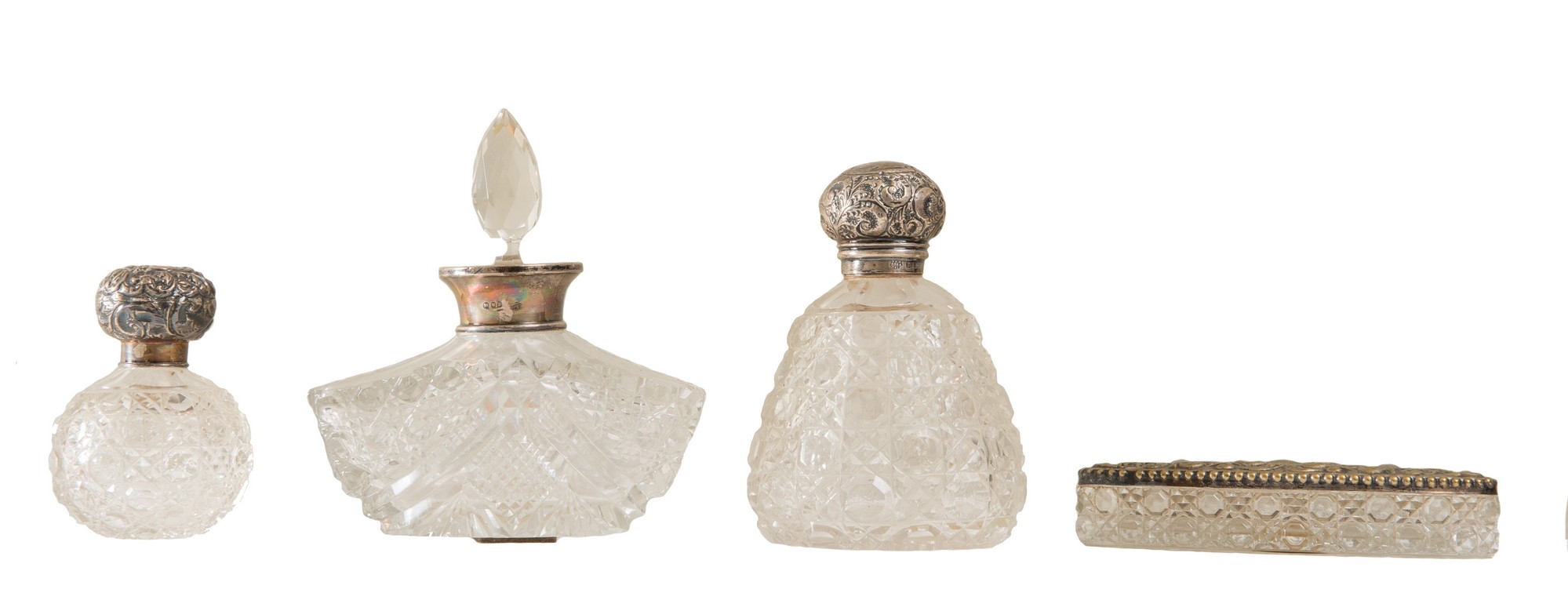 SERVIZIO DA BAGNO INGLESE Lotto composto da 4 elementi in cristallo e argento: Boccetta porta profumo o sapone realizzata in cristallo sbalzato con motivi geometrici. Tappo in argento sbalzato a motivi vegetali e floreali. Al retro reca punzoni. Cm 8,5x6,6. Scatolina a forma ovale in cristallo sbalzato con motivi geometrici. Coperchio senza cerniera in argento sbalzato a motivi vegetali e floreali. Al retro reca punzoni. Cm 2,5x13,3x3,5. Boccetta porta profumo o sapone realizzata in cristallo sbalzato con motivi geometrici. Tappo in argento sbalzato a motivi vegetali e floreali. Al retro reca punzoni. Cm 12x9. Boccetta porta profumo o sapone realizzata in cristallo sbalzato con motivi geometrici, vegetali e floreali. Tappo in argento e cristallo sbalzato. Al retro reca punzoni. Cm 14x13x5.