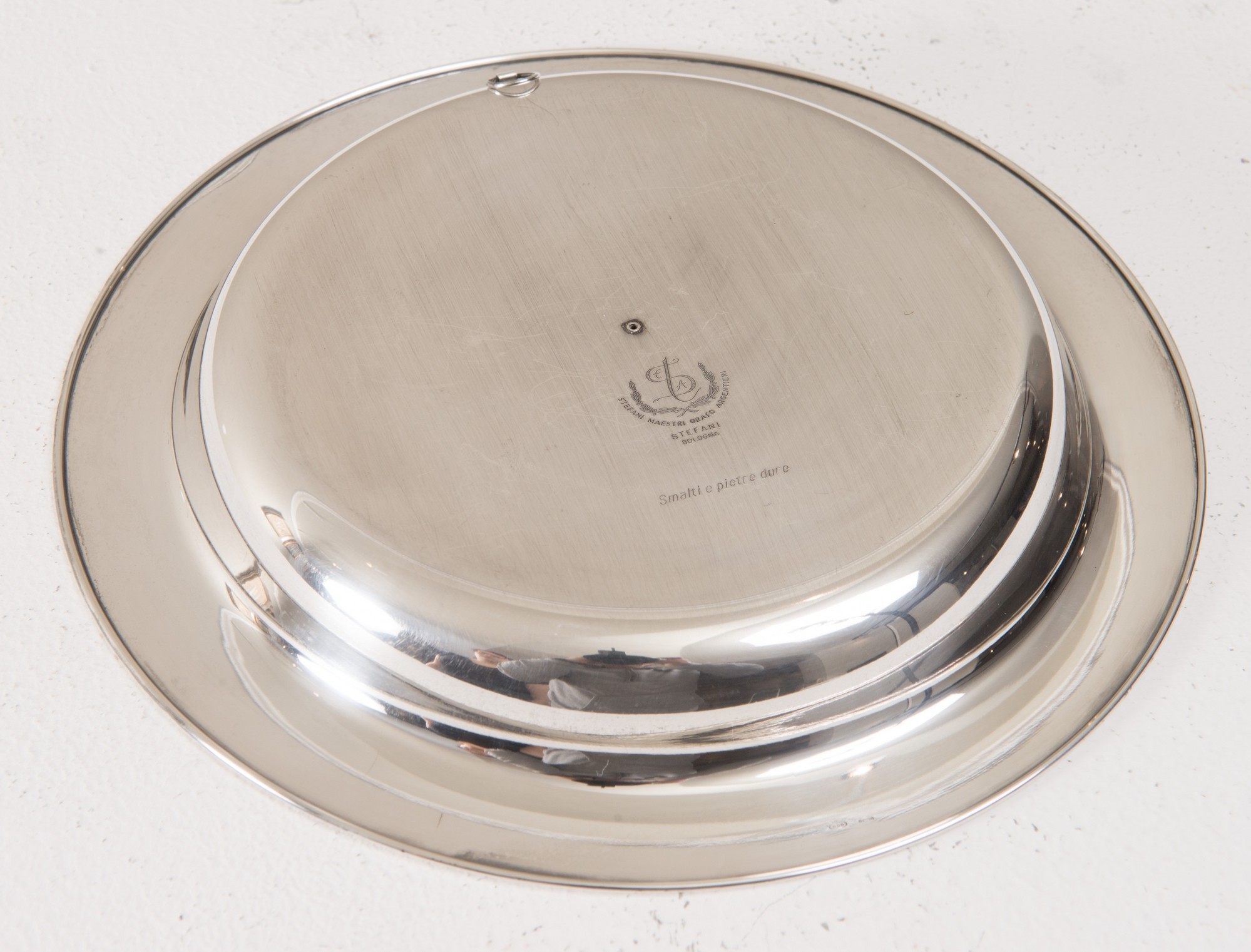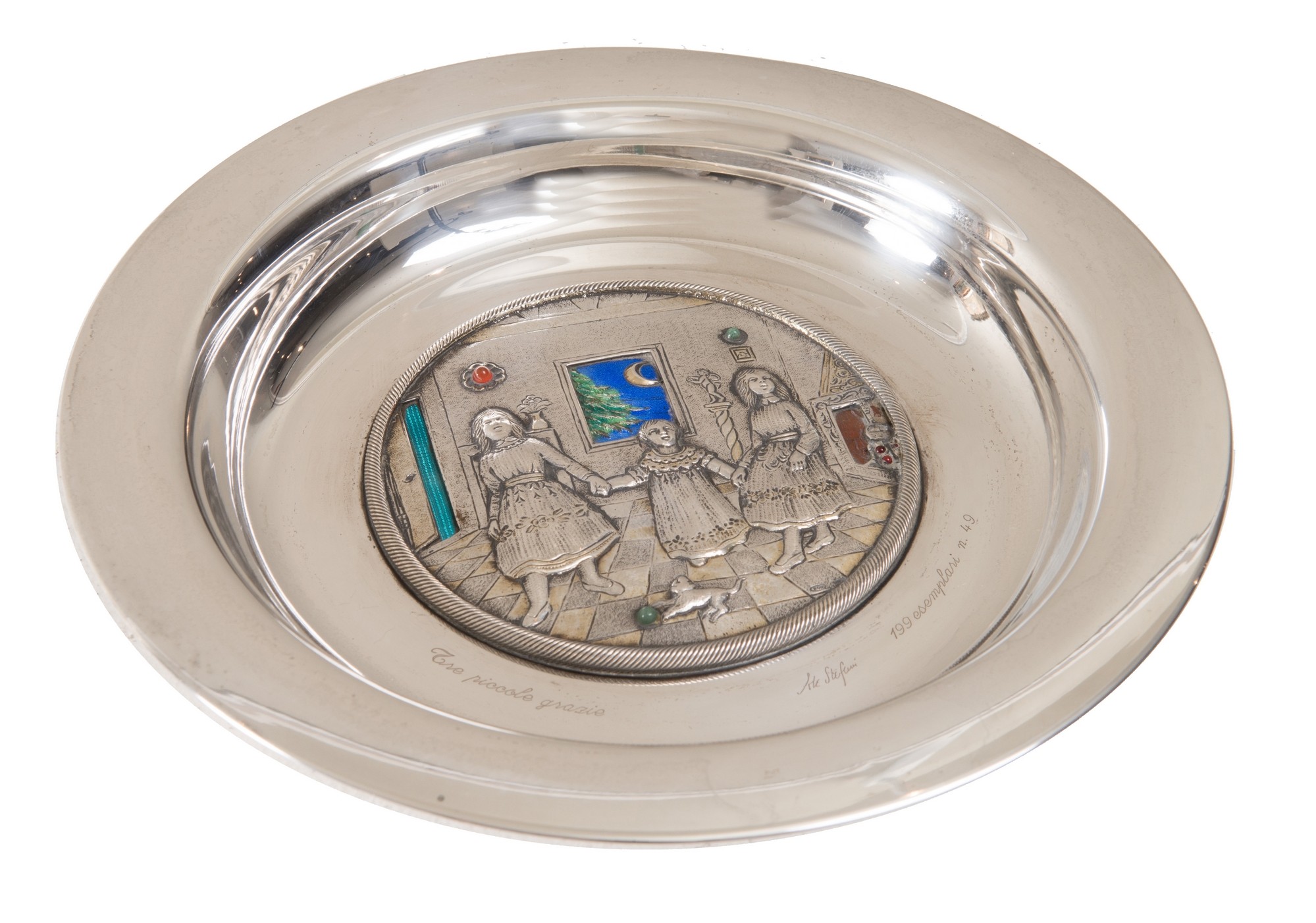 ARGENTERIA e OREFICERIA STEFANI, XX secolo Fondina dal titolo “Tre piccole Grazie” firmata e numerata, esemplare n. 49 di 199. Argento 800 con dorature in oro 24 Kt., smalti a fuoco e pietre dure. Alla base reca firma Ale Stefani. Reca sotto la base marchio, tecnica e punzoni. Accompagnato da garanzia di provenienza Stefani, maestri argentieri in Bologna. Officina Stefani Maestri argentieri in Bologna. Peso 300 gr., diametro cm. 22.