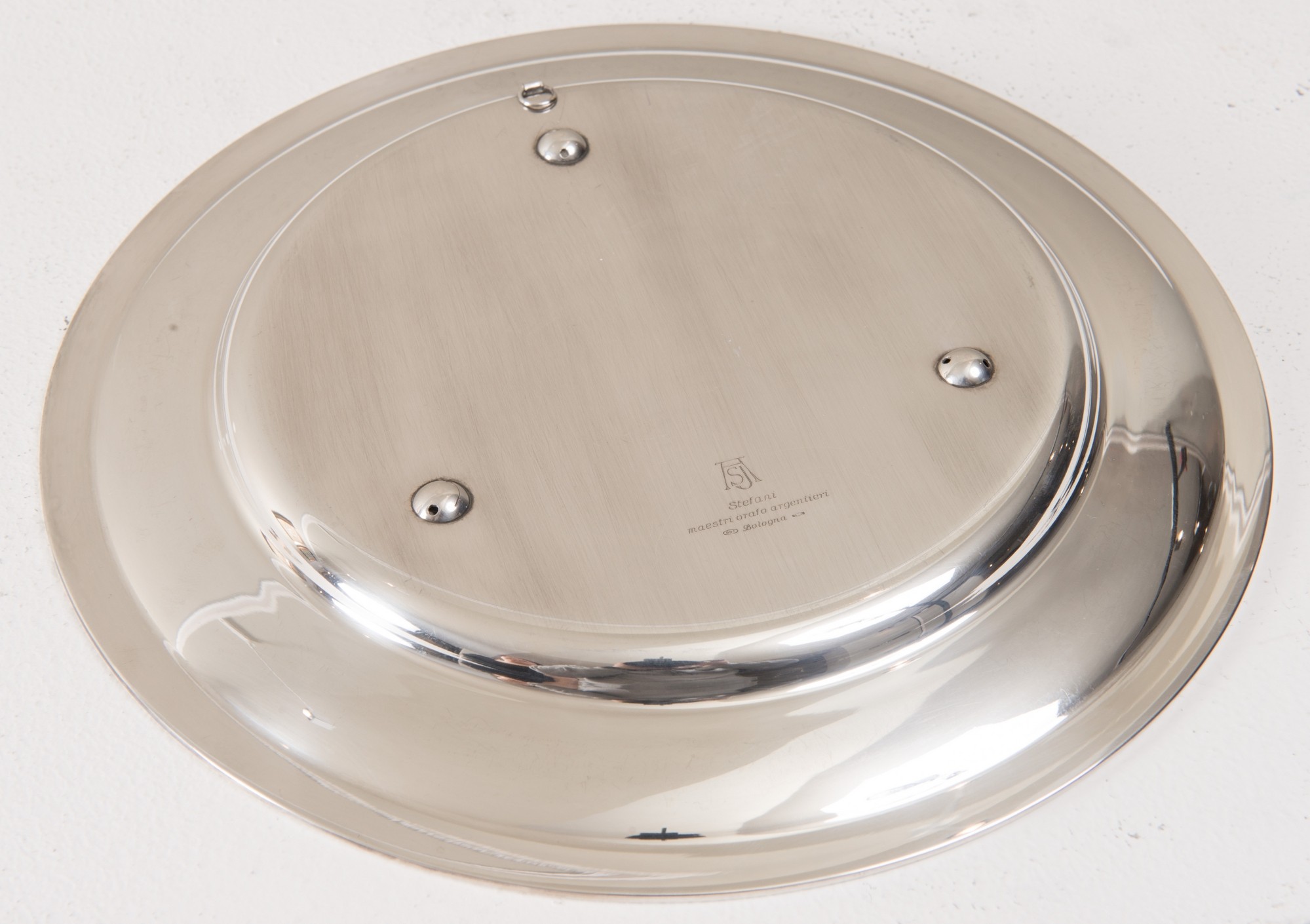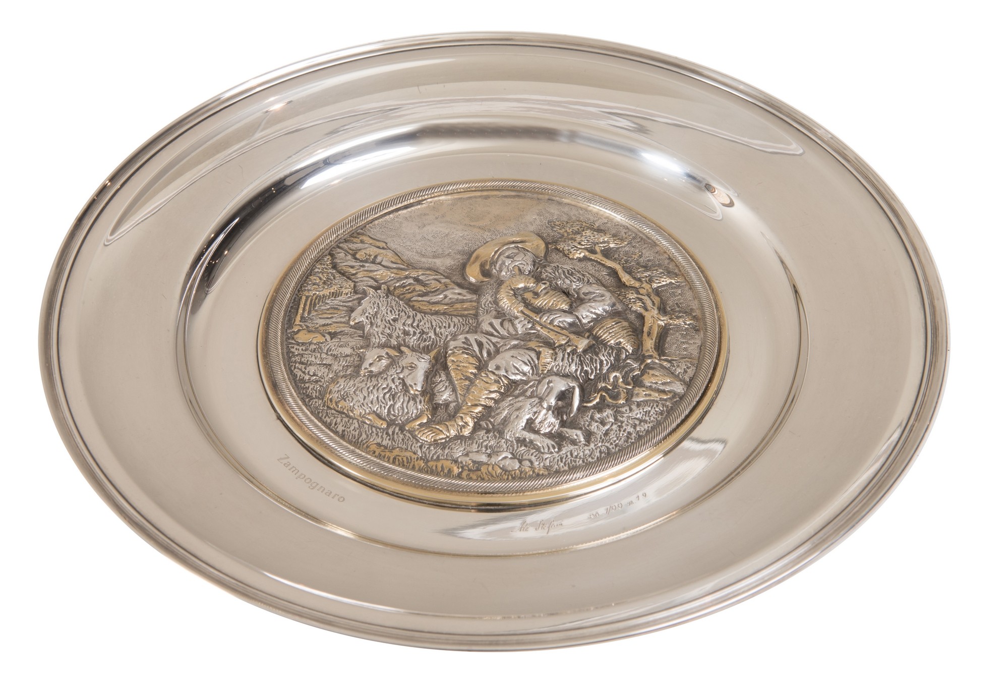ARGENTERIA e OREFICERIA STEFANI, XX secolo Fondina dal titolo “Zampognaro” numerata e firmata, esemplare n. 19 di 99. Argento 800, superfici dorate. Alla base reca firma Ale Stefani. Reca sotto la base marchio e punzoni. Accompagnato da garanzia di provenienza Stefani, maestri argentieri in Bologna. Peso 478 gr., diametro cm. 27,5