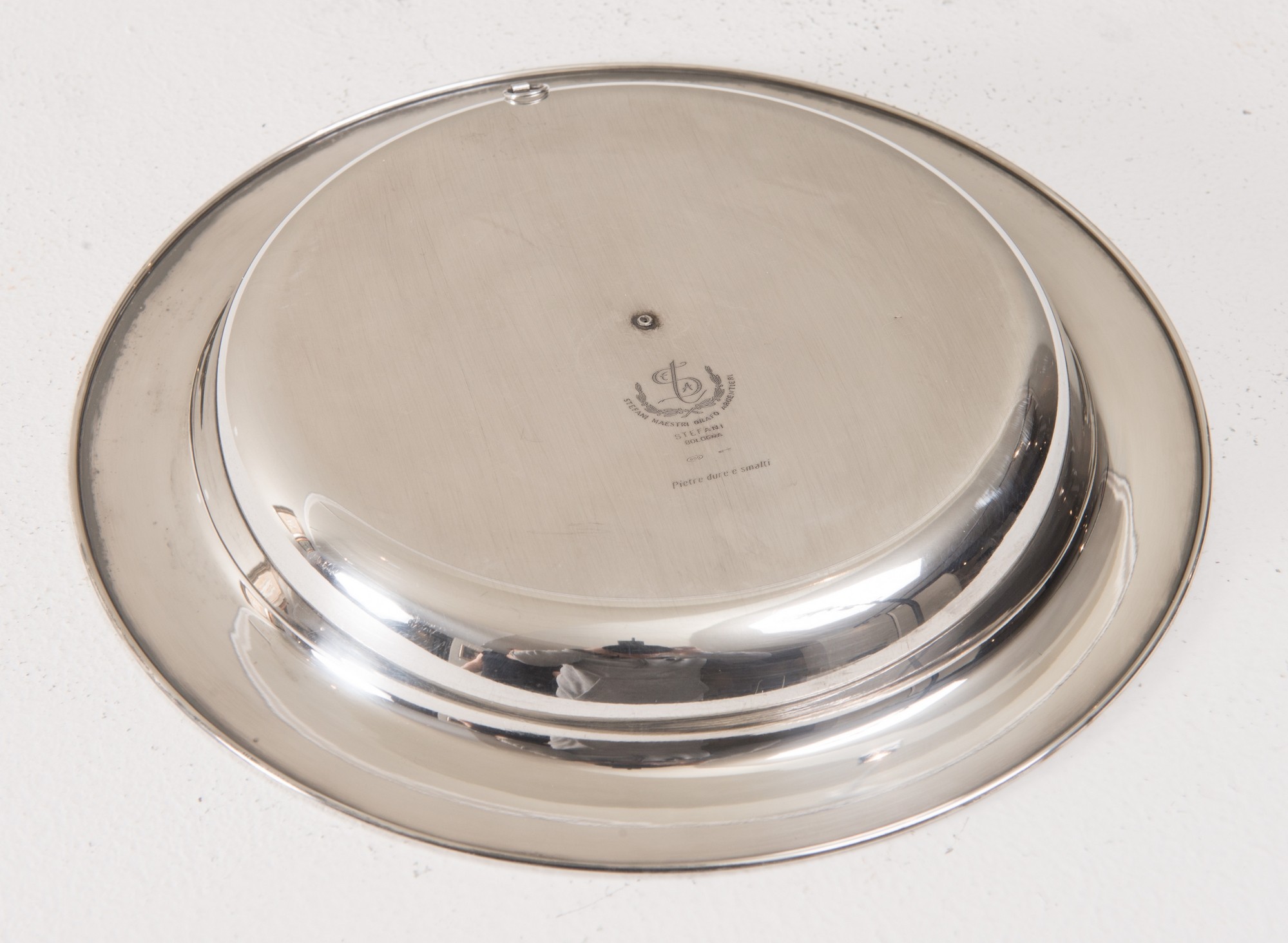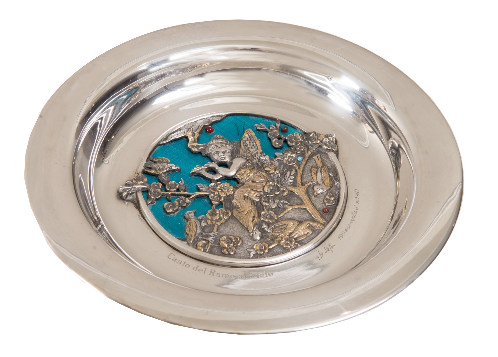 ARGENTERIA e OREFICERIA STEFANI, XX secolo Fondina dal titolo “Canto del ramo al cielo” numerata e firmata, esemplare n.140 di 199. Argento 800, particolari al centro in oro 24 Kt, smalti gran fuoco e cabochon a pietre dure. Alla base reca firma Ale Stefani. Reca sotto la base marchio, tecnica e punzoni. Accompagnato da garanzia di provenienza Stefani, maestri argentieri in Bologna. Peso 332 gr., diametro cm. 22.