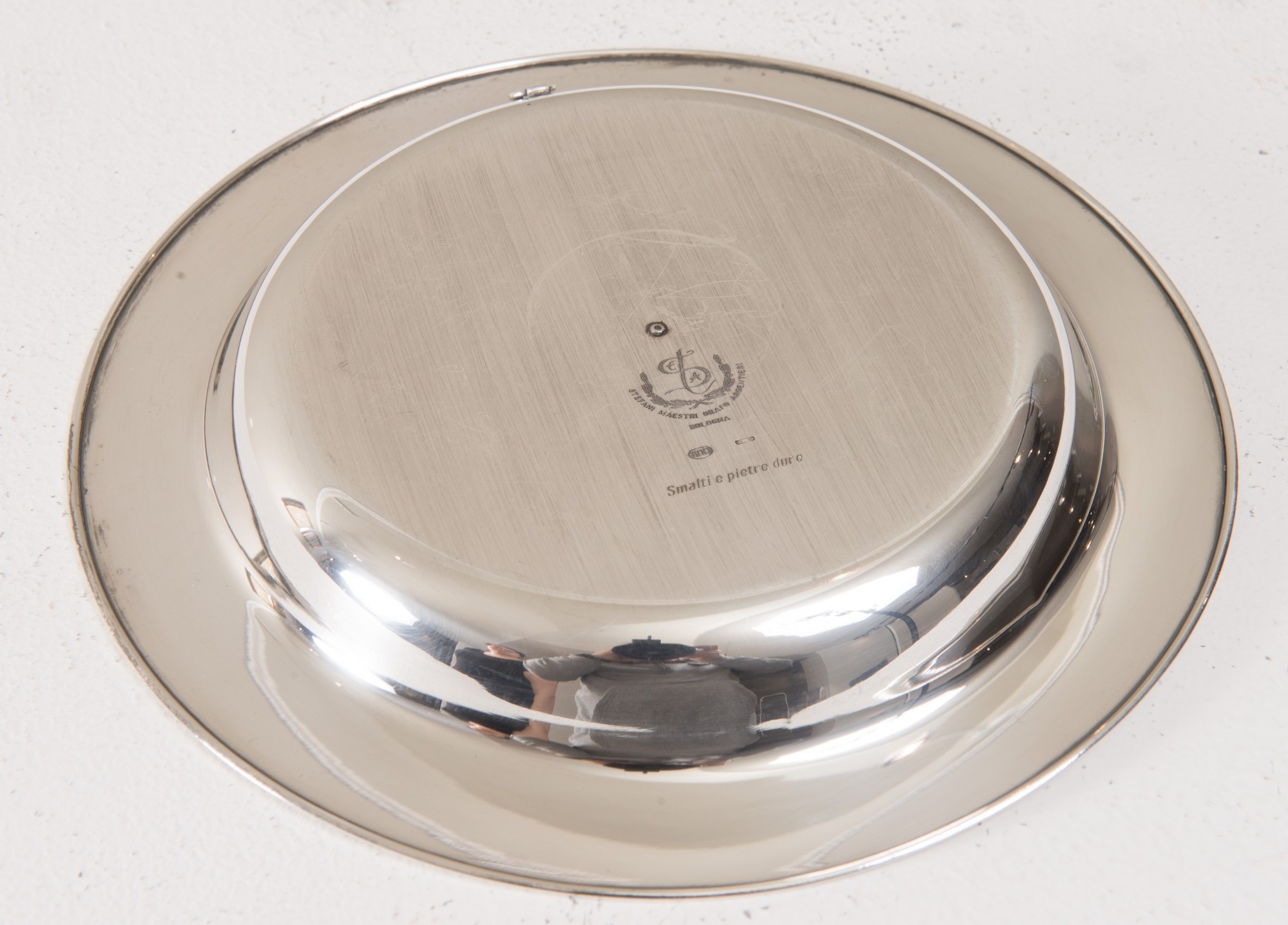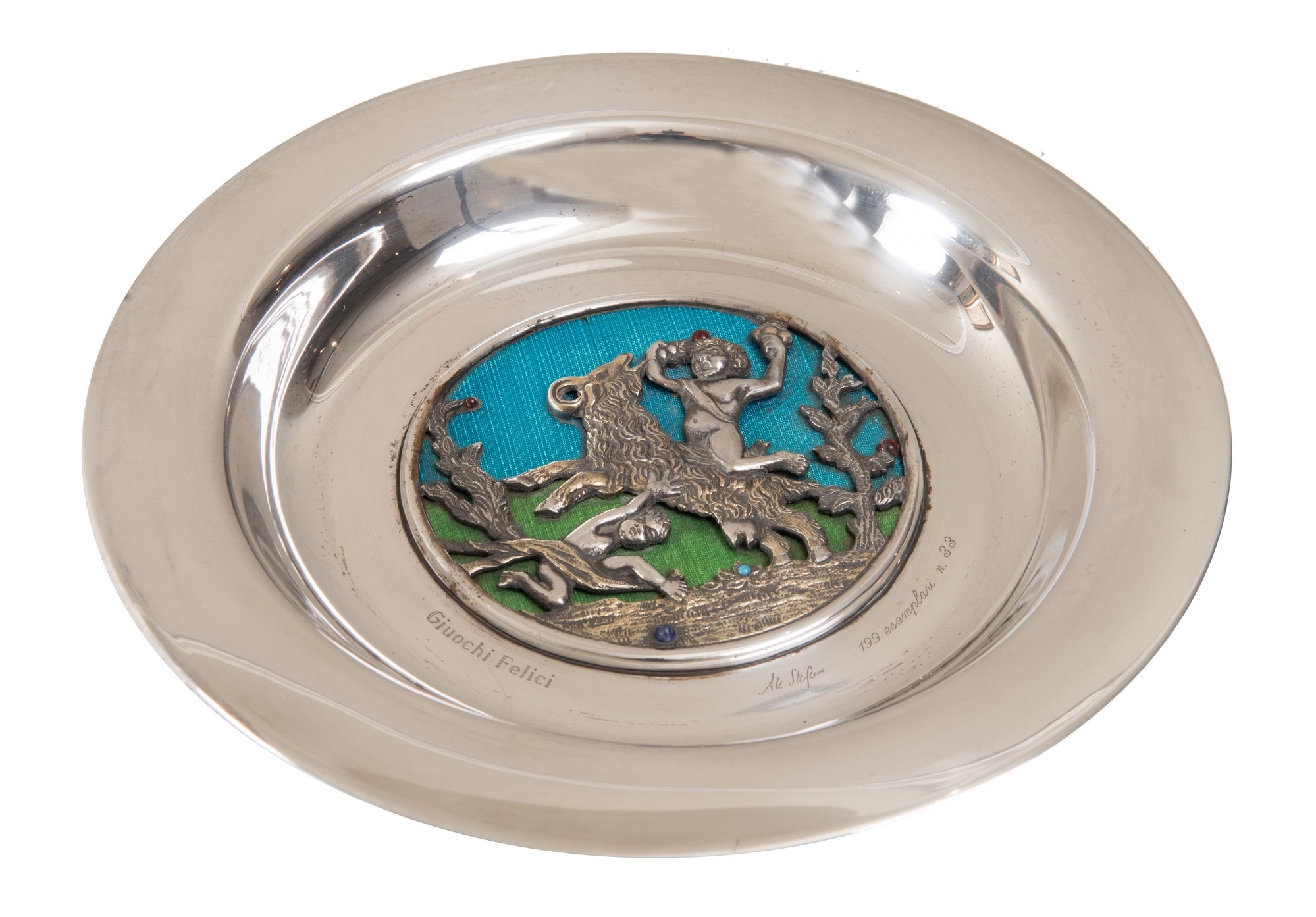 ARGENTERIA e OREFICERIA STEFANI, XX secolo Fondina dal titolo “Giuochi felici” numerata e firmata, esemplare n. 33 di 199. Argento 800, parti dorate con oro zecchino, smalti a gran fuoco e cabochon di pietre dure. Alla base reca firma Ale Stefani. Reca sotto la base marchio, tecnica e punzoni. Accompagnato da garanzia di provenienza Stefani, maestri argentieri in Bologna. Peso 312 gr., diametro 22 cm.