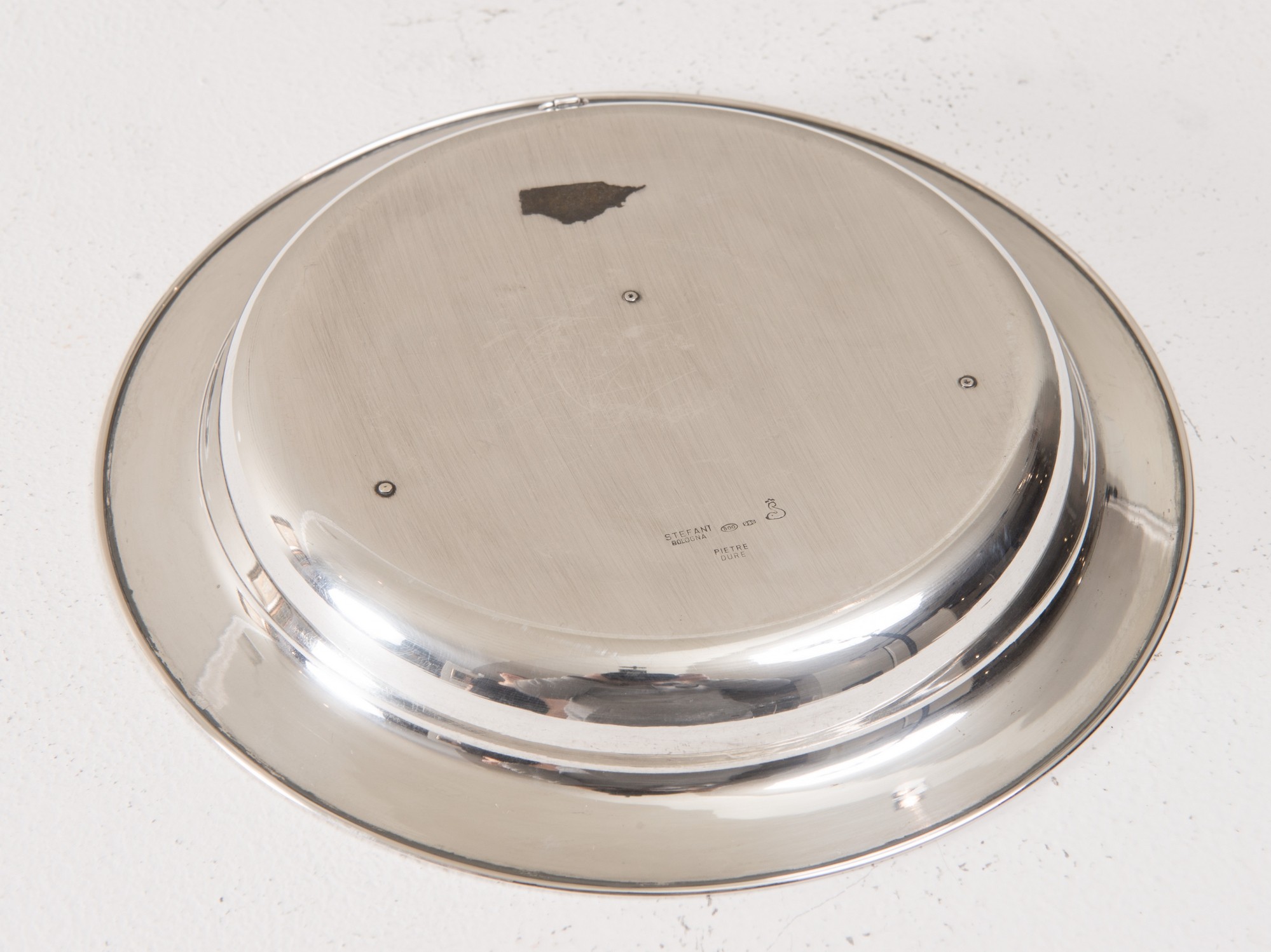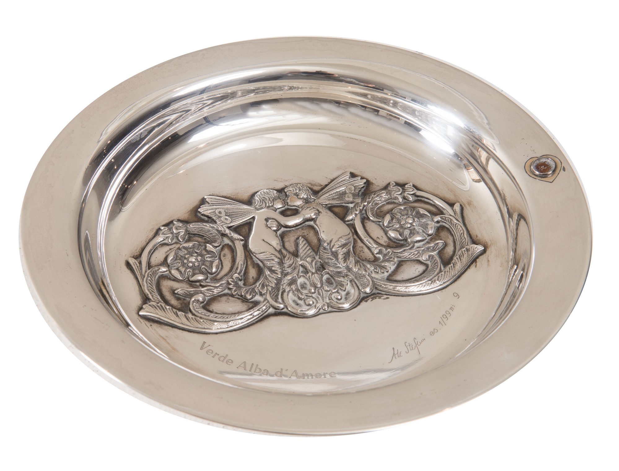 ARGENTERIA e OREFICERIA STEFANI, XX secolo Fondina dal titolo “Verde alba d'amore” numerata e firmata, esemplare n. 9 di 199. Tecnica a mano con riporto sbalzato e cesellato, argento 800, dorata a fuoco. Alla base reca firma Ale Stefani. Reca sotto la base marchio, tecnica e punzoni. Accompagnato da garanzia di provenienza Stefani, maestri argentieri in Bologna. Peso 281 gr., diametro 22 cm.