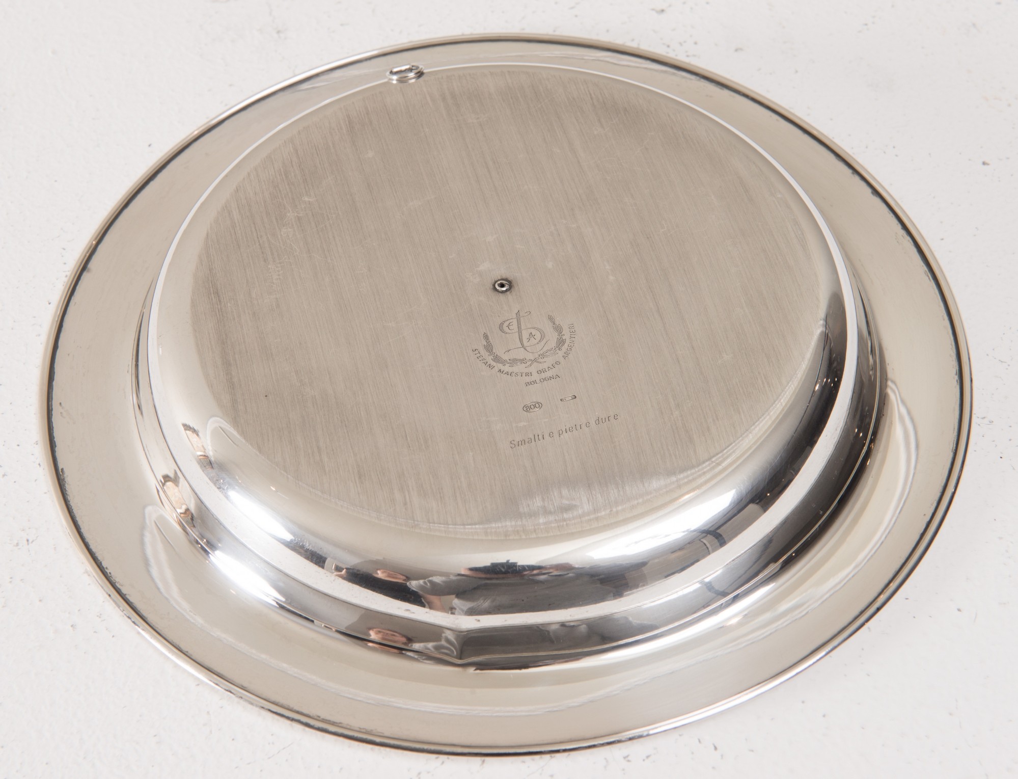 ARGENTERIA e OREFICERIA STEFANI, XX secolo Fondina dal titolo “Insegnamenti gentili” numerata e firmata, esemplare n. 67 di 199. Argento 800, smalti a fuoco, doratura in oro zecchino e pietre dure. Alla base reca firma Ale Stefani. Reca sotto la base marchio, tecnica e punzoni. Accompagnato da garanzia di provenienza Stefani, maestri argentieri in Bologna. Peso 345 gr., diametro 22 cm.