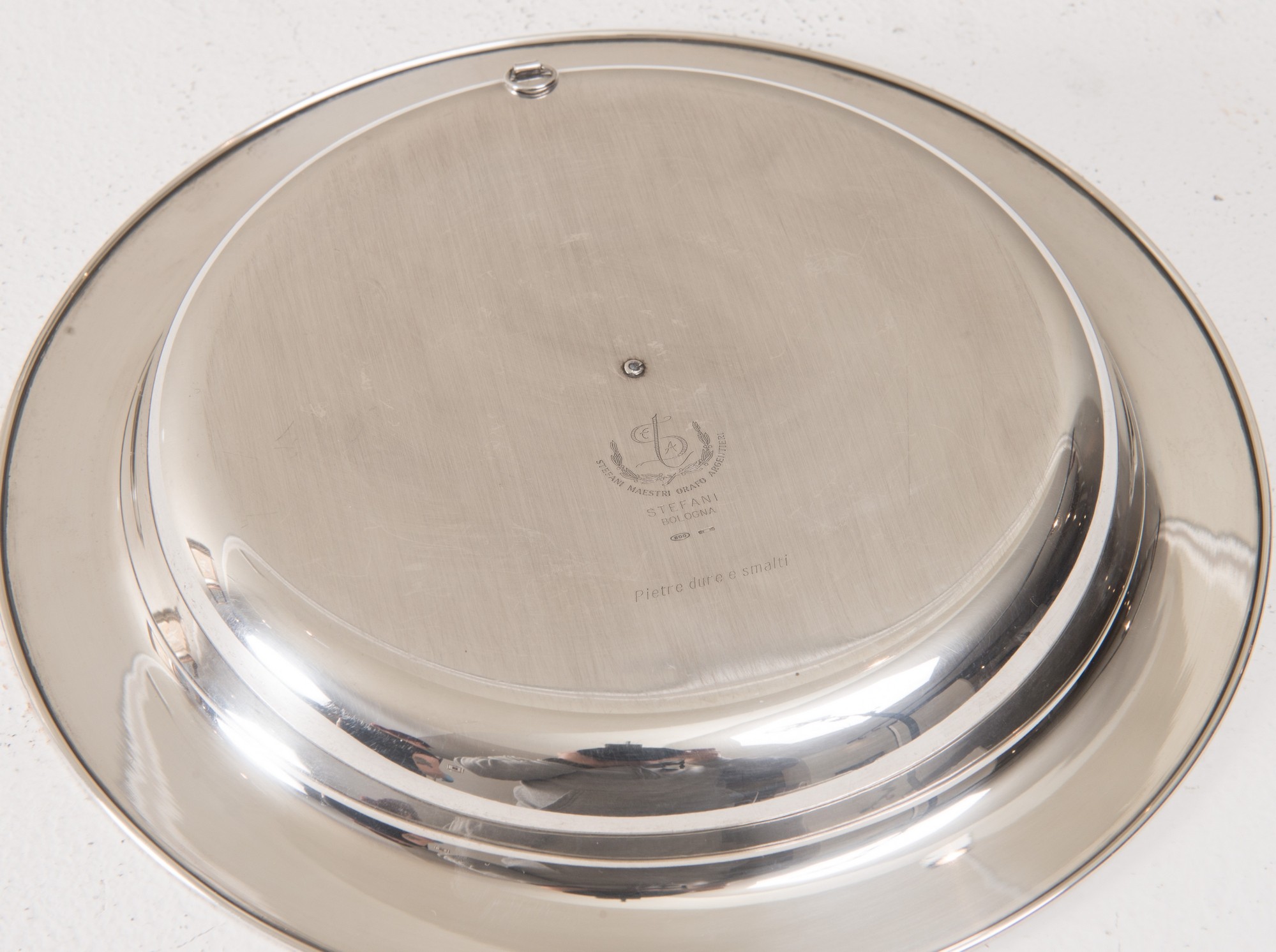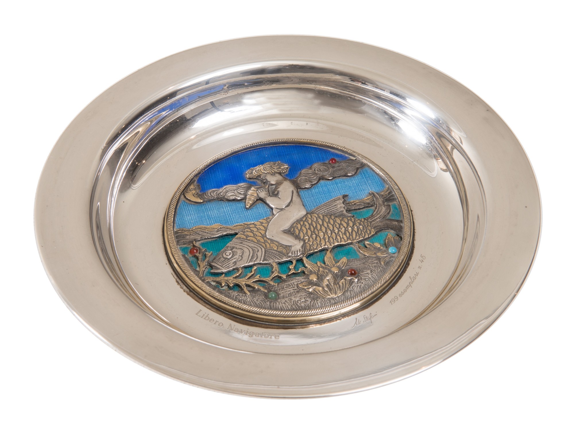 ARGENTERIA e OREFICERIA STEFANI, XX secolo Fondina dal titolo “Libero navigatore” numerata e firmata, esemplare n. 45 di 199. Argento 800, superfici dorate con oro puro, smalti a gran fuoco, cabochon di pietre dure. Alla base reca firma Ale Stefani. Reca sotto la base marchio, tecnica e punzoni. Accompagnato da garanzia di provenienza Stefani, maestri argentieri in Bologna. Peso 322 gr., diametro 22 cm.