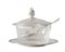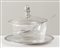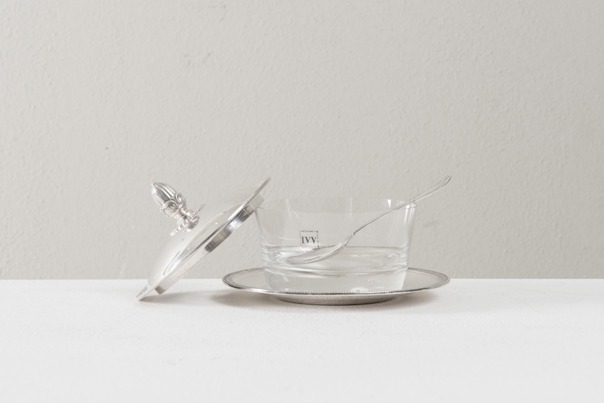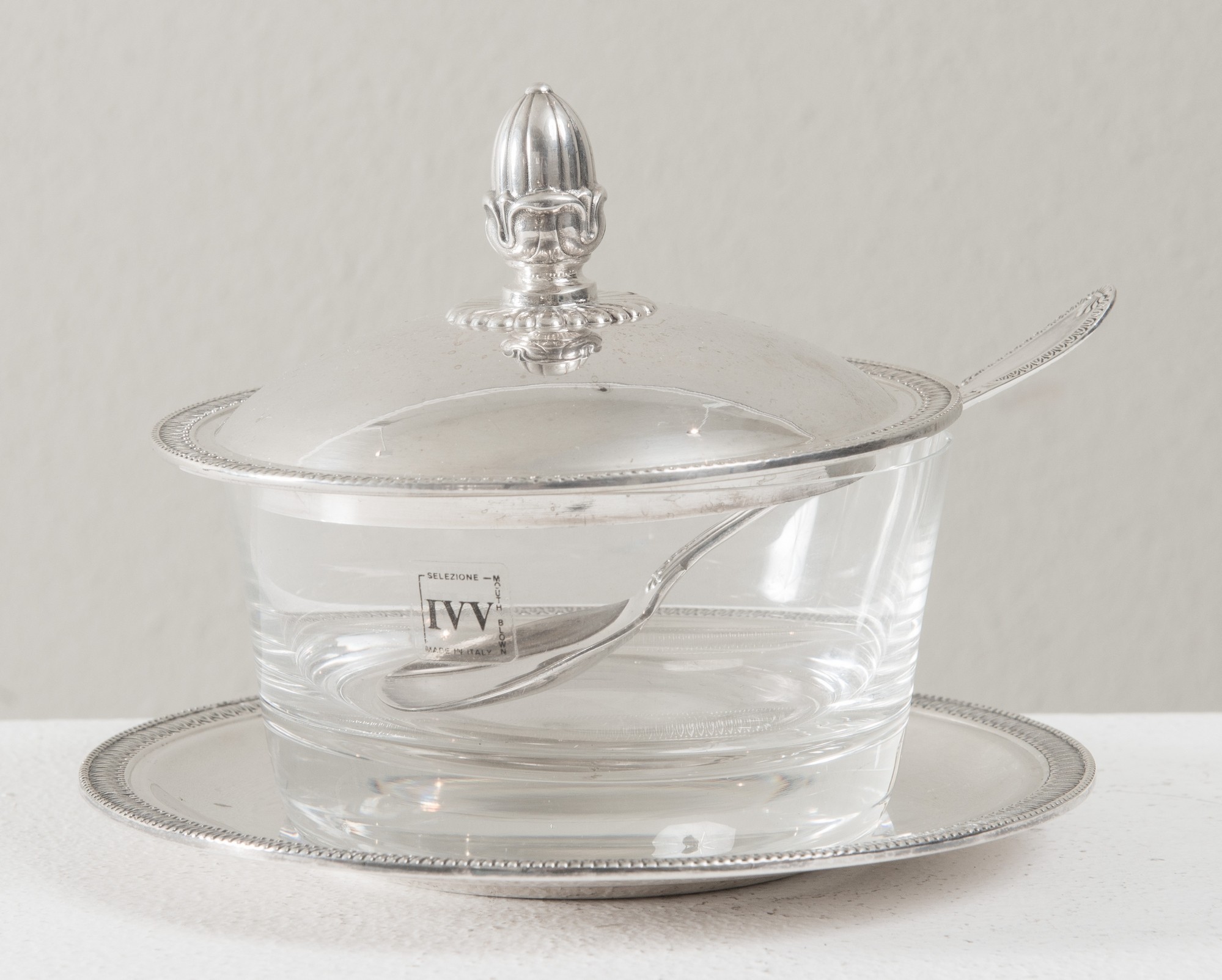 FORMAGGIERA IN STILE IMPERO Realizzata in argento 800, presenta coperchio, piattino e cucchiaino in argento 800, con motivi a foglie lanceolate. Presenta contenitore di vetro. Punzoni presenti sotto il coperchio, al retro del piattino e del cucchiaino. Peso 232 gr. Diametro cm. 15.