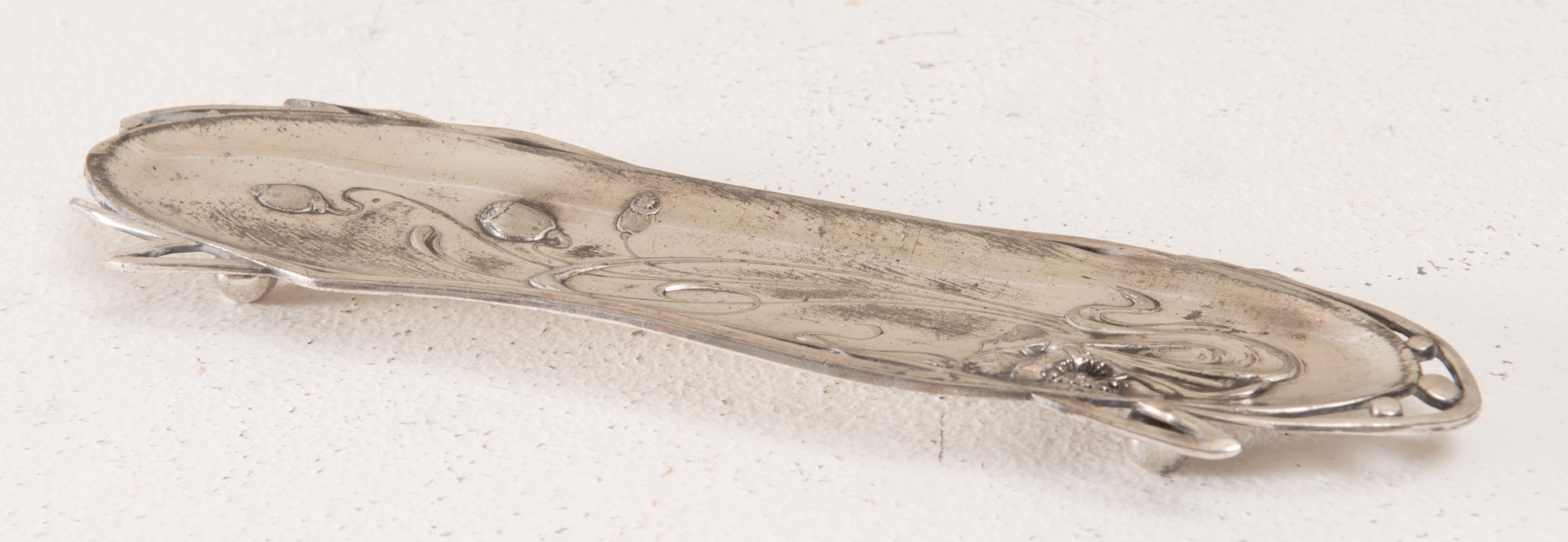 POGGIAPENNE LIBERTY Realizzato in metallo argentato, presenta decori floreali e volto femminile e poggia su quattro piedini circolari. Cm 1x24x6. Reca difetti.