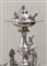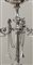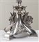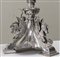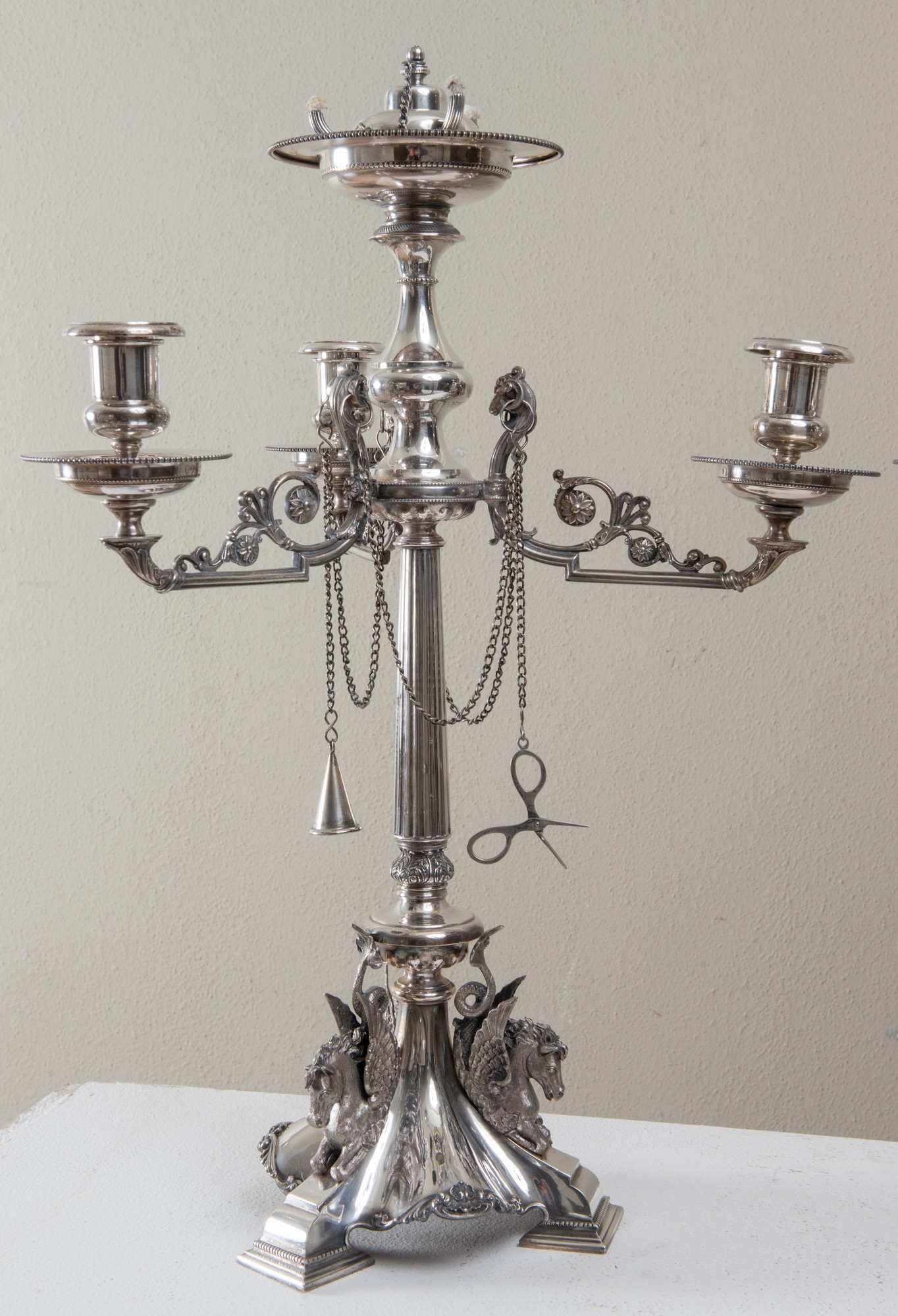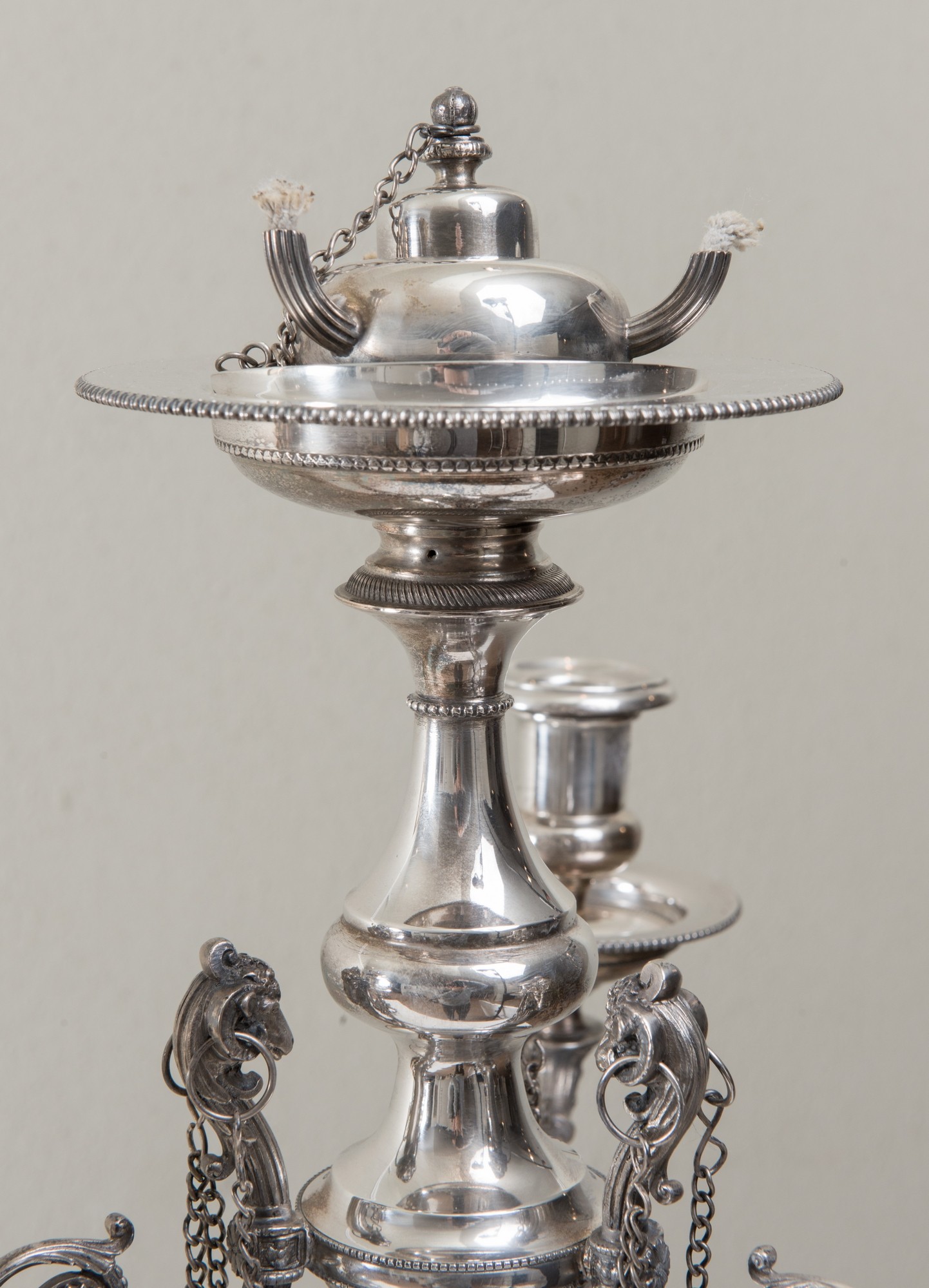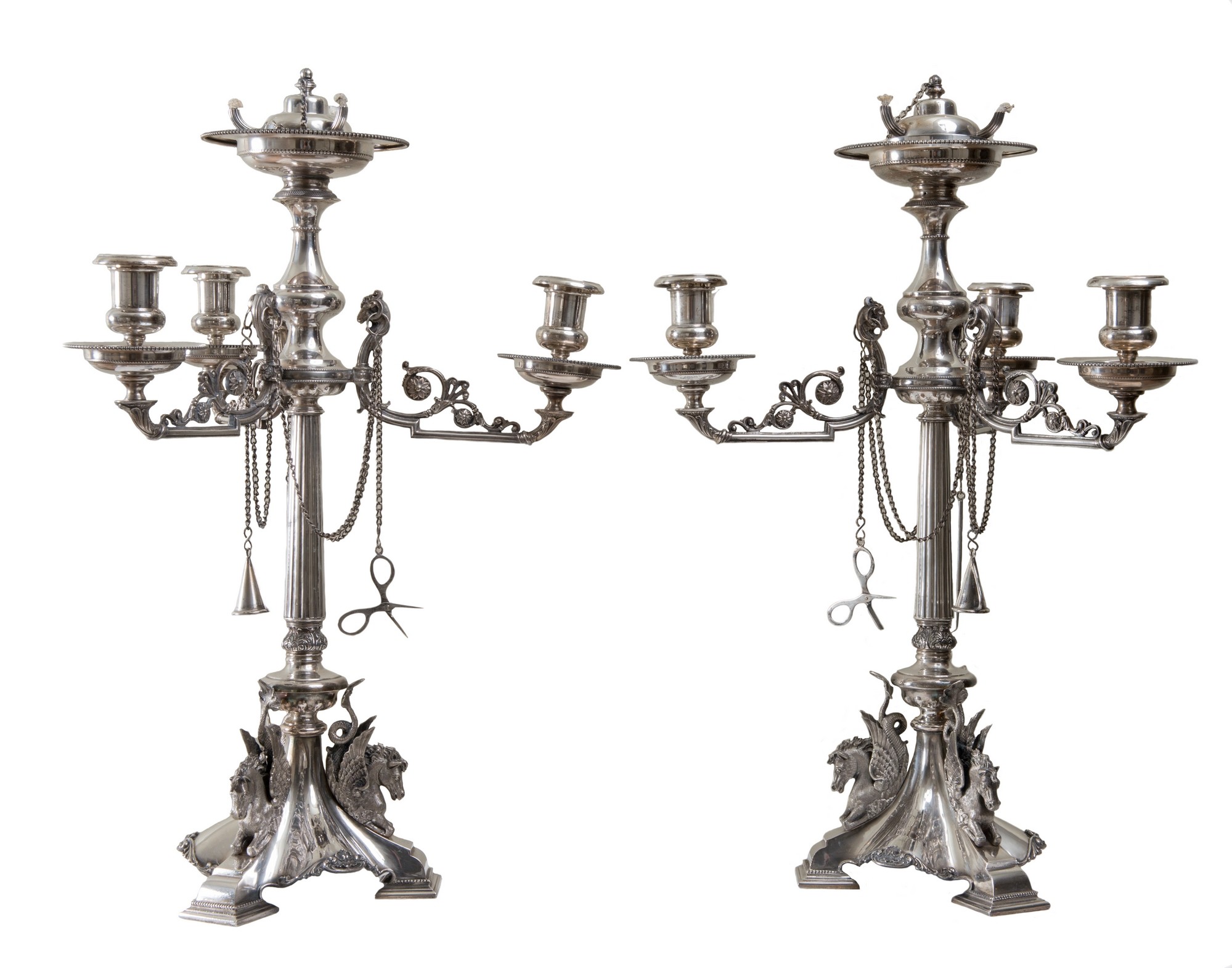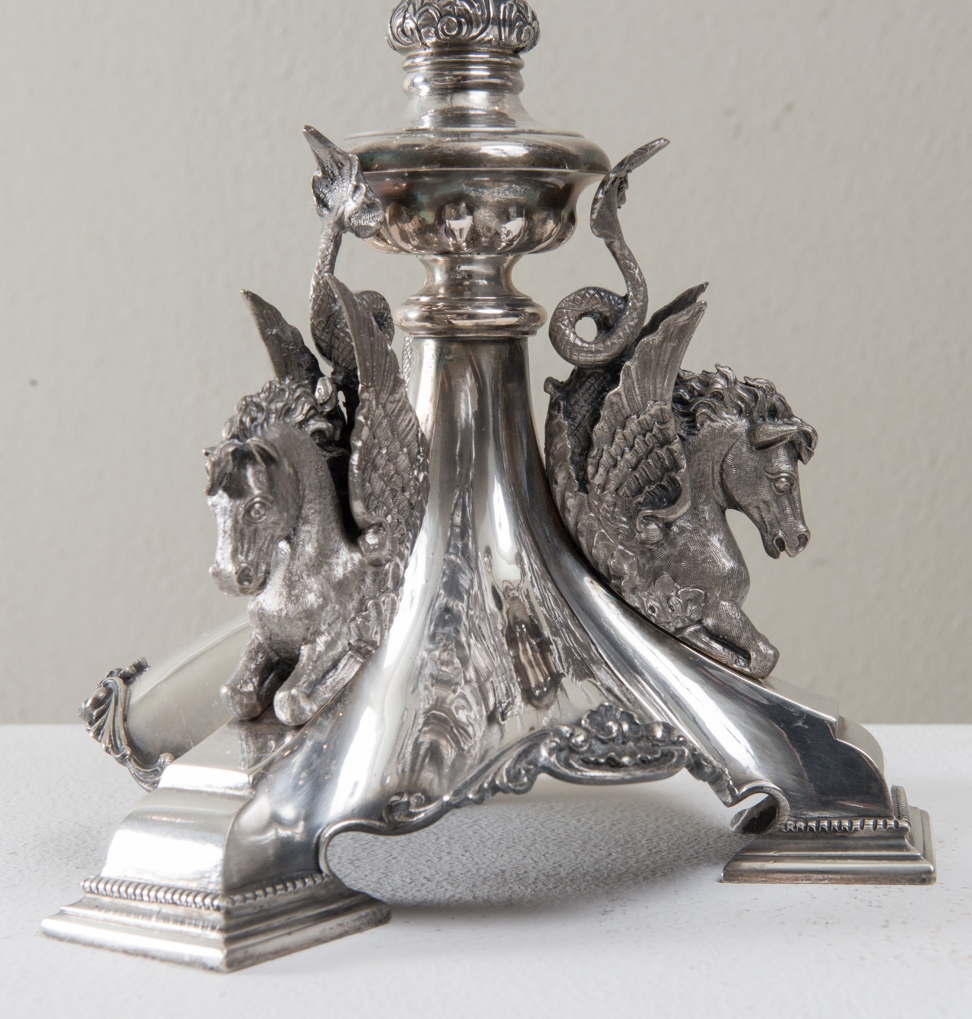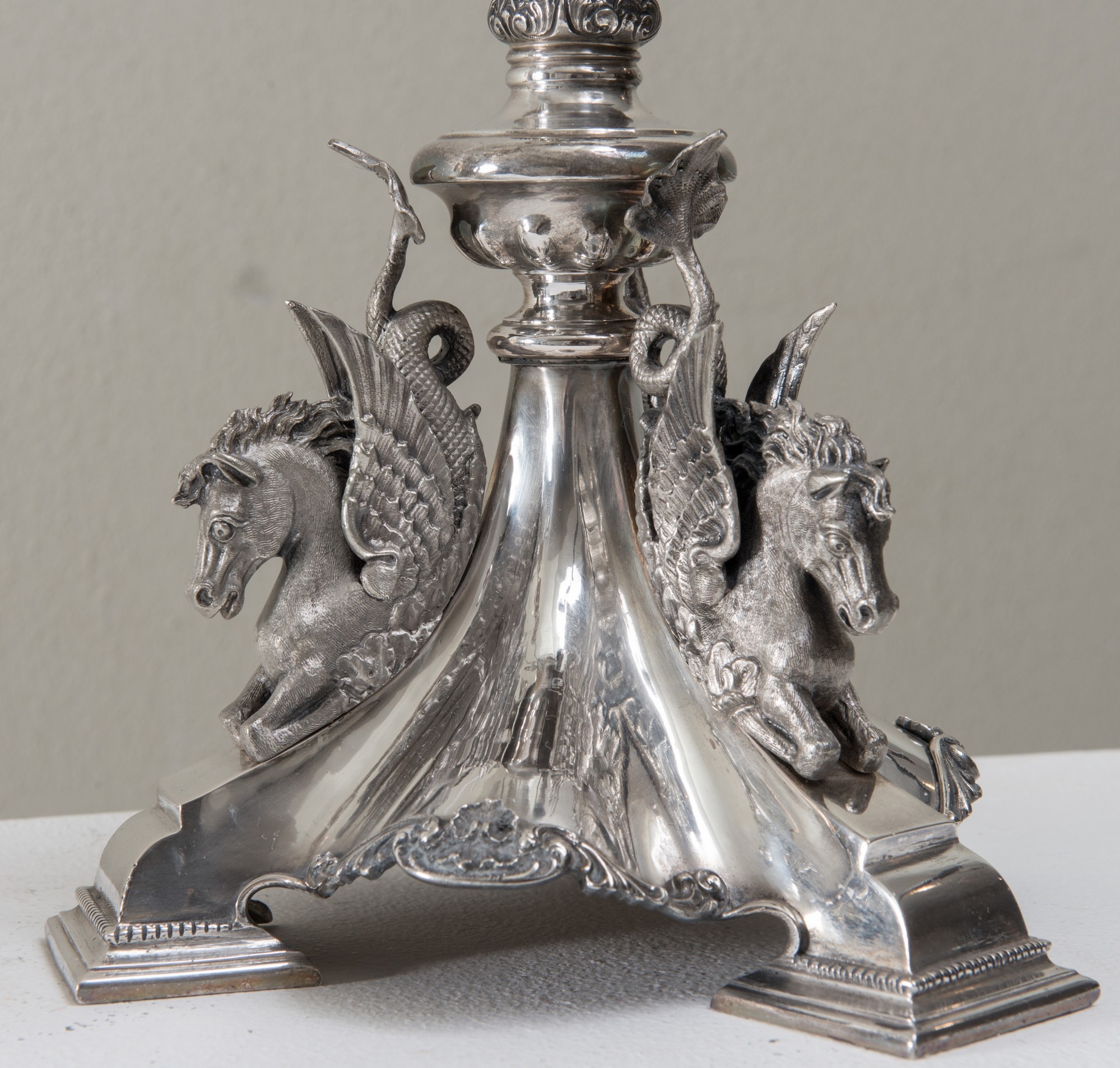 COPPIA DI LUCERNE FIORENTINE IN ARGENTO 800 Complete di accessori e riccamente decorate. Fusto sbalzato scanalato da cui dipartono tre bracci decorati con motivi floreali, zoomorfi e teste di arieti culminati con portacandela. Alla sommità presenta lucerna ad olio decorata con motivi geometrici. Il tutto poggia su base mistilinea, decorata con ippocampi alati, su piedi rettangolari. Alla base reca punzoni. Peso: 3452 gr., 3411 gr.; Peso totale: 6863 gr. . Cm: 58x40x40 cadauna.