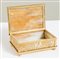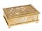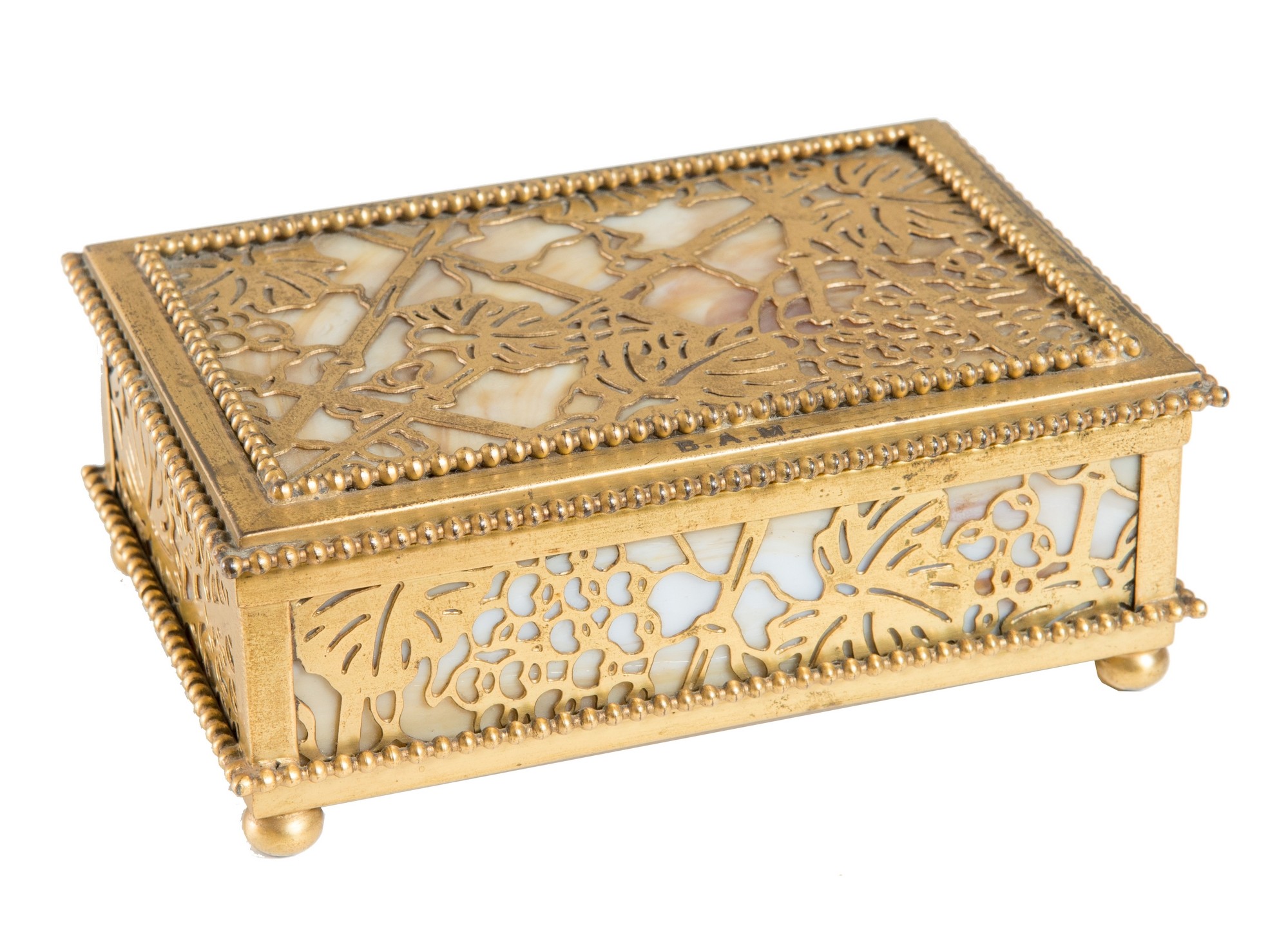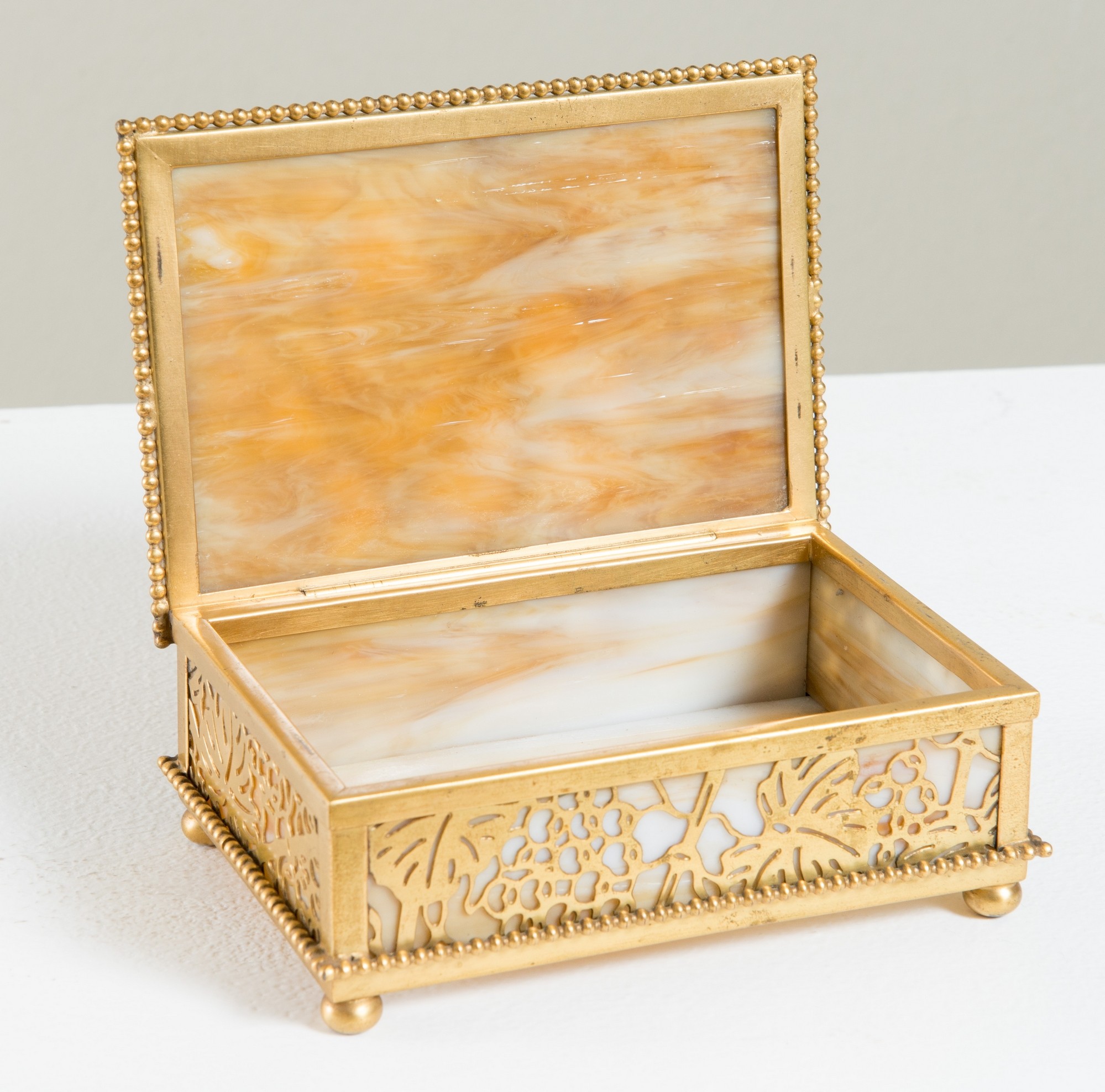 PORTAGIOIE GRAPEWINE di TIFFANY, Studios New York Scatola portagioie rettangolare, in metallo inciso nel modello Grapewine dorato acidato, applicato su vetro colorato striato caramello e bianco in finitura dorata Tiffany Studios. Coperchio con cerniera. Sostenuta da quattro piedini rotondi. Sul coperchio reca incisione con iniziali B.A.M. Alla base reca marchio e numero di serie. Cm 5x14x9,6; Numero di serie: 808.