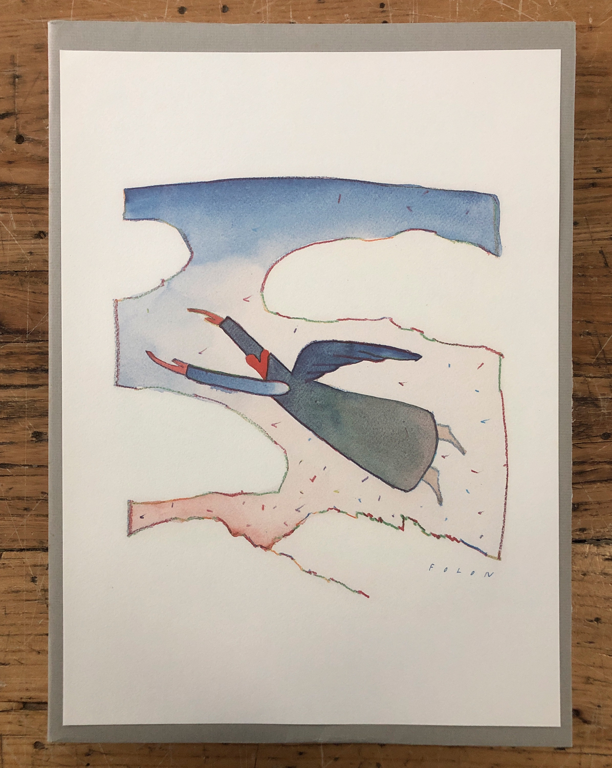 Volume contenente 5 fotolitografie di Jean-Michel Folon, ciascuna recante firma e datazione in lastra, e un'antologia di testi di Sergio Ferrero, Giuliana Morandini, Raffaele Nigro, Emilio Tadini e Dante Troisi