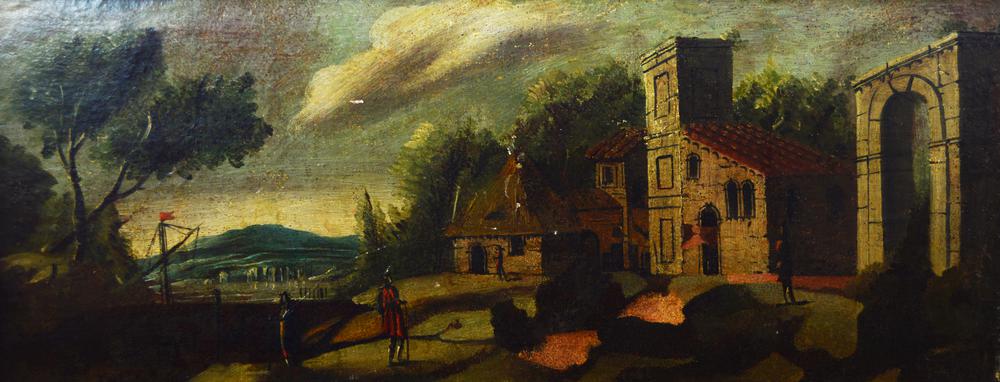 Scuola del XX secolo VEDUTA olio su tela, cm 92x37 L'opera presenta alcune...