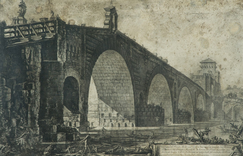 Francesco Piranesi Veduta del Ponte Molle sul Tevere due miglia lontan da Roma Acquaforte di cm. 43,5x67, su carta di cm. 55x77 La carta presenta imperfezioni dovute al tempo. Titolo e firma sulla lastra in basso a destra.