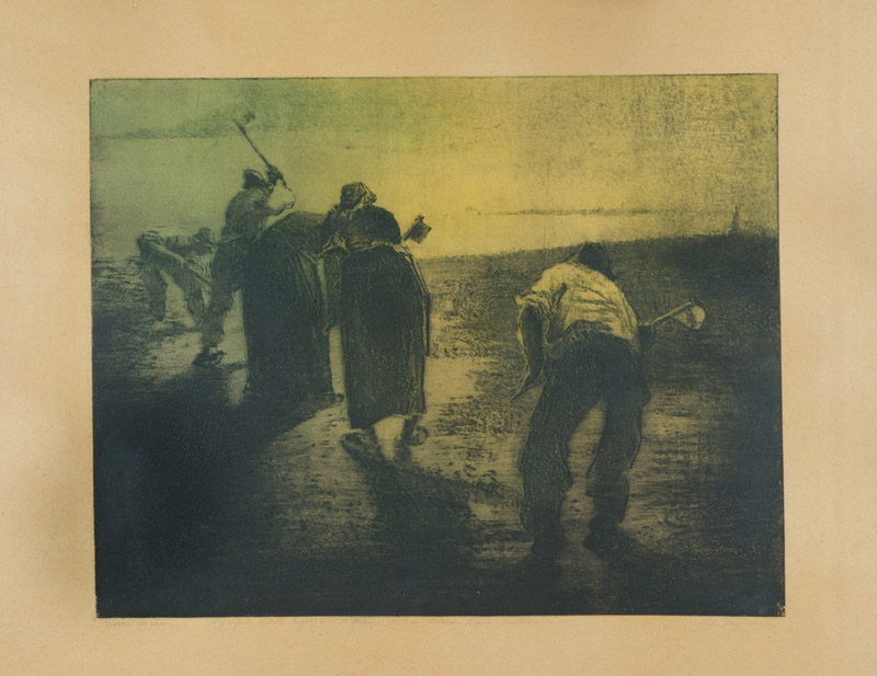 Ubaldo Magnavacca Contadini al lavoro Acquaforte di cm. 49,5x63, su carta di cm. 70x85 La carta presenta tracce di umidità. Firmato in basso a destra.