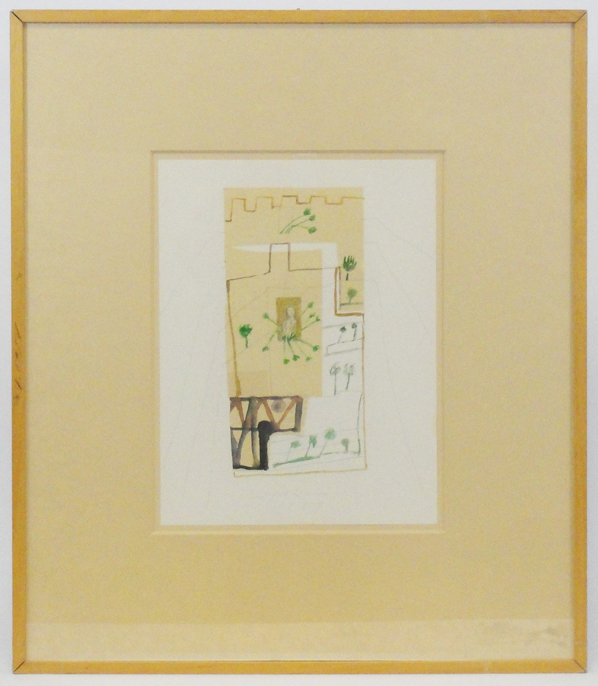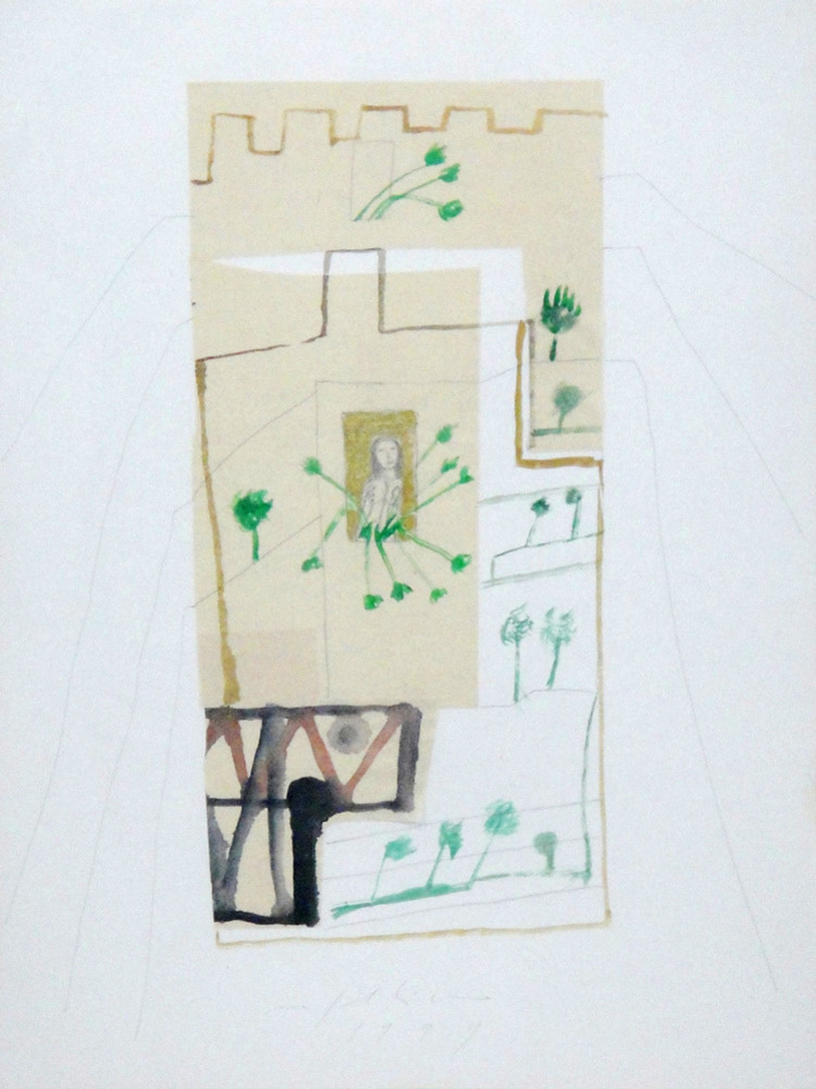 Acquarello e collage su carta 40x29,5 cm; firma in basso al centro.