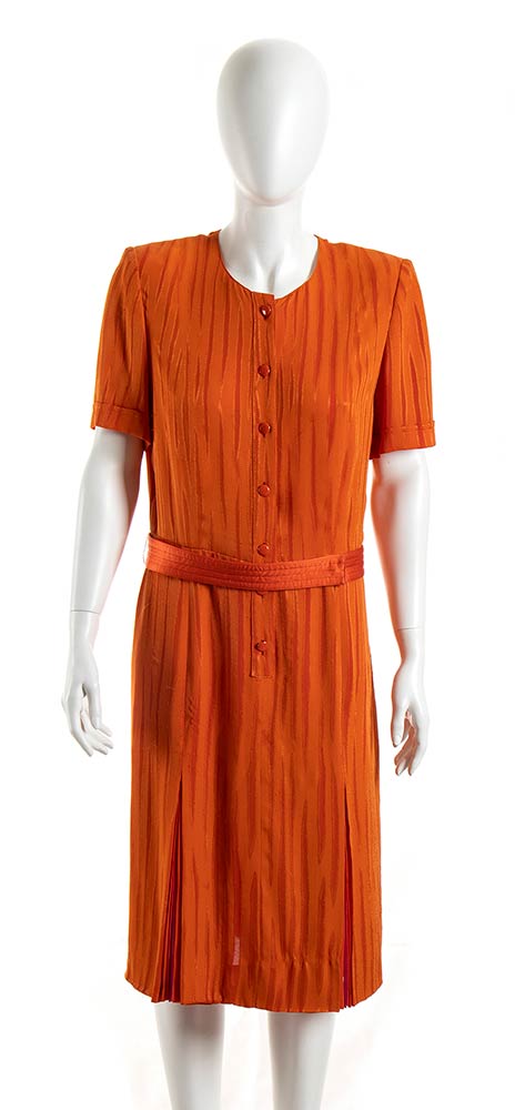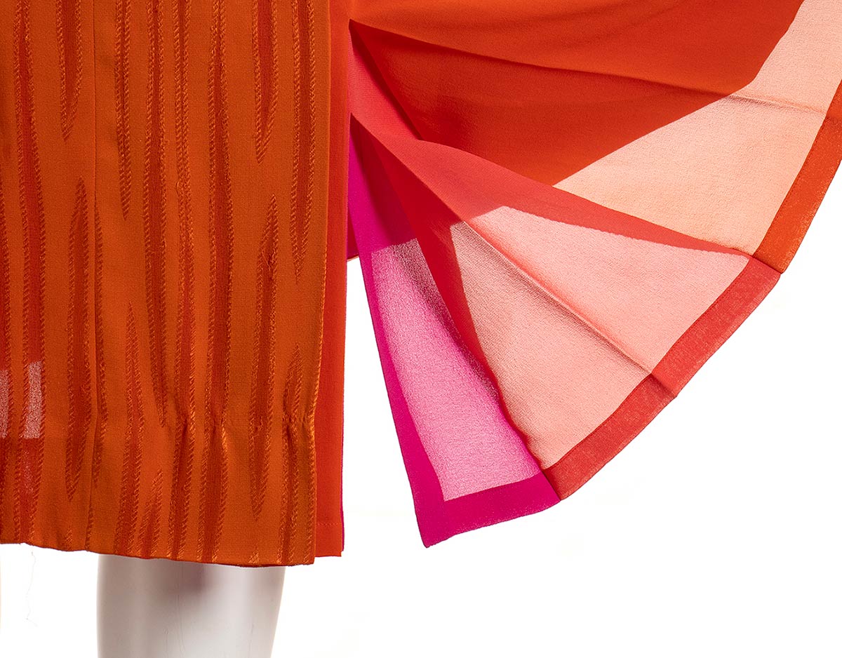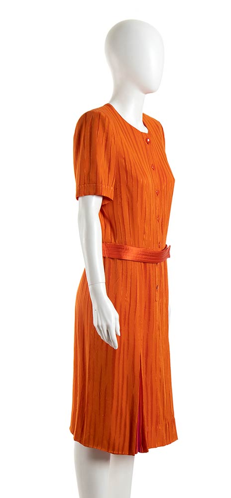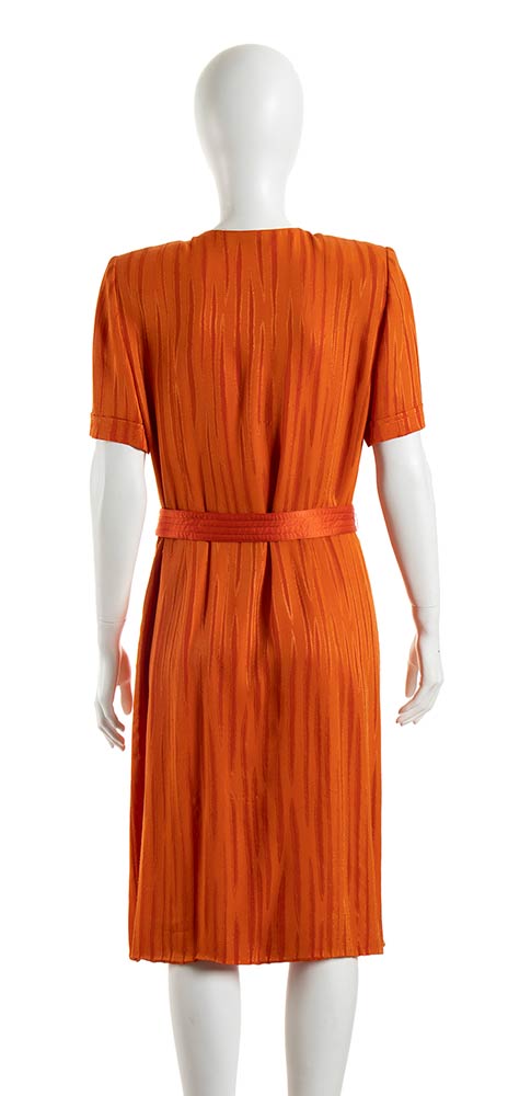 Abito in seta jacquard arancione, fodera e sottogonna in seta fucsia, cintura, Busto cm 100
