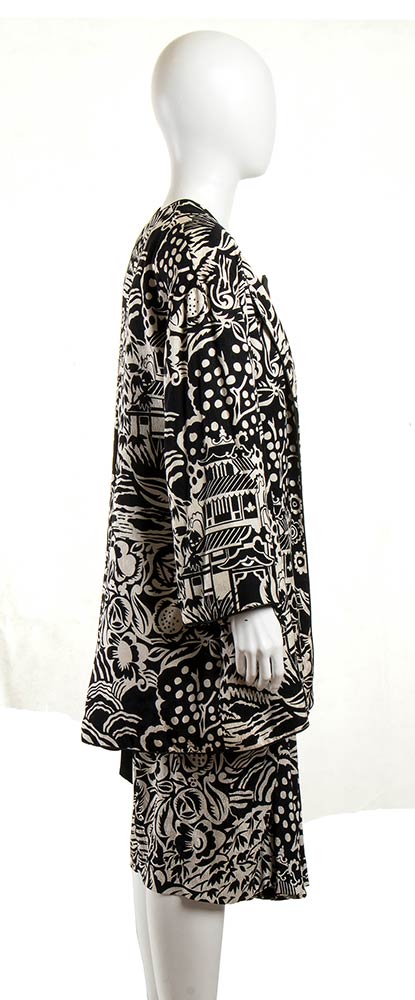 Completo (gonna, giacca e top) in seta jacquard con motivo in bianco e nero
