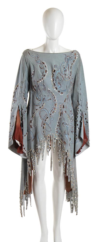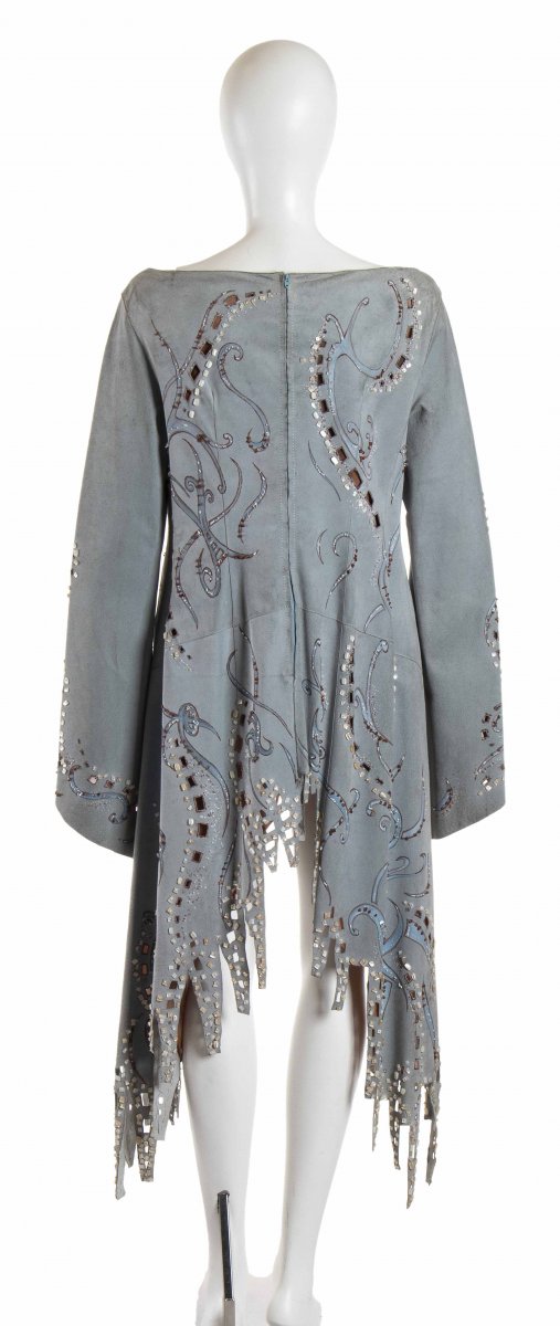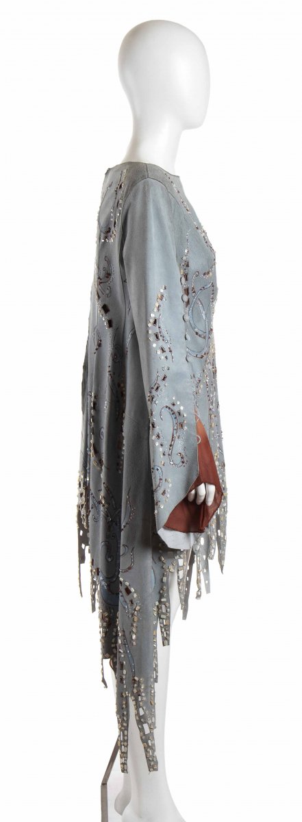 Mini abito/casacca in pelle scamosciata azzurra dipinta a mano, intagliata e ricamata, fodera in chiffon marrone
