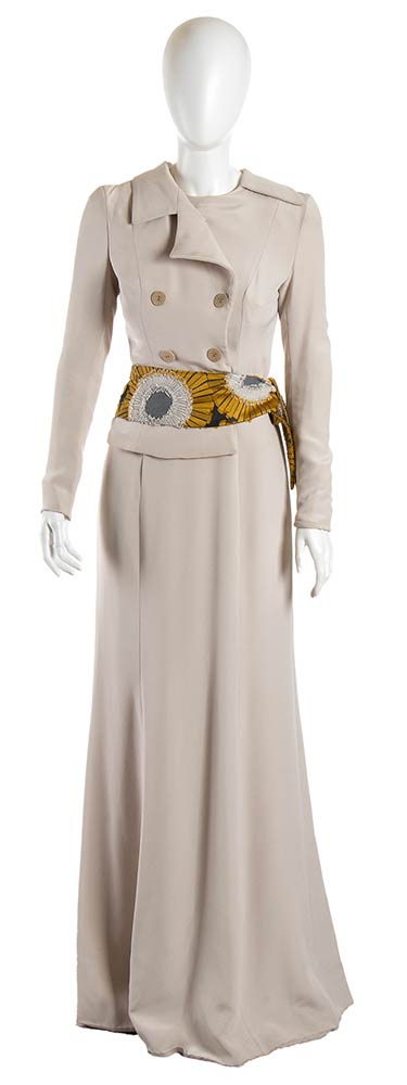 Abito in cadì grigio chiaro, fusciacca in seta,
