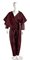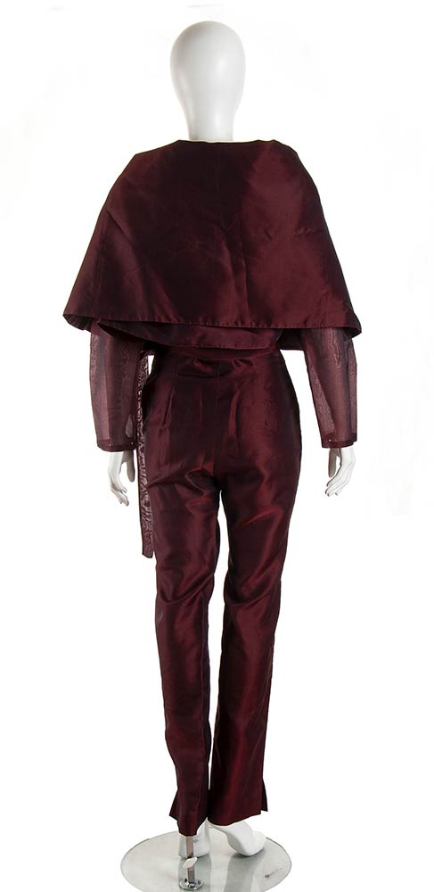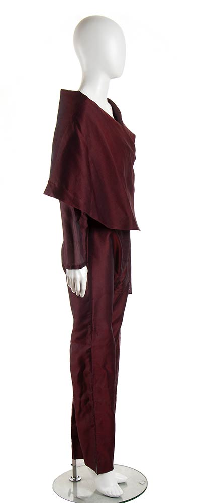Completo (giacca e pantalone) in taffetà bordeaux, giacca /camicia con grande collo e allacciatura laterale